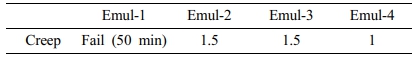 유화제 종류 및 점착부여제의 함량에 따른 수성 아크릴 점착제의 물성평가. 제조된 수성형 아크릴 점착제의 유화제 조합 및 점착부여제의 함량에 따른 물성테스트를 진행하였다. 유화제 조합에 따른 물성차이를 관찰하기 위해, 동일한 함량의 점착부여제를 사용하고 유화제 조합을 달리하여 Emul-1, Emul-2, Emul-3 그리고 Emul-4로 점착제를 제조하였다. 점착부여제의 함량에 따른 점착물성의 변화를 관찰하기 위하여 Emul-4와 동일한 조성에 점착부여제의 함량을 감소시킨 Emul-5, Emul-6, Emul-7 점착제를 제조하였다.