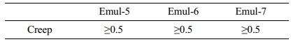 고형분 측정: 용제형 가모용 점착제 3종의 고형분 농도를 측정하였으며, 그 결과는 Table 3에 나타내었다. 고형분 농도는 SIGNATURE Longest and Most Reliable hold의 경우 35.59%, STRONG HOLD EXTEXDER WARE의 경우 40.44%, MITY-TITE DAILY WEAR의 경우 41.11%를 갖는 것으로 측정되었다. 제조된 수성 점착제의 고형분은 유화제의 종류에 관계없이 Emul-1, Emul-2, Emul-3 그리고 Emul-4의 경우에는 57±1%의 고형분 농도를 갖는 것으로 측정되었으며 전환율은 모두 99% 이상을 갖는 것으로 확인되었다. Emul-4와 동일한 조성에 점착부여제 함량을 감소시킨 Emul-5, Emul-6, Emul-7의 경우에는 58.1±1%, 57.9±1%, 57.6±1%의 고형분 농도가 미세하게 증가하는 것으로 측정되었으며 전환율은 모두 99% 이상을 갖는 것으로 확인되었다.