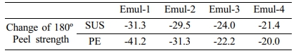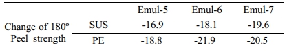 점착부여제의 함량에 따른 점착력 변화를 관찰하기 위하여 박리강도가 제일 우수한 Emul-4에 점착부여제의 함량을 감소시킨 Emul-5, Emul-6, Emul-7의 박리강도를 측정하여 Table 5에 나타냈다. Emul-5의 경우 피착제가 SUS, PE에서 2130, 690 g/25 mm, Emul-6의 경우 피착제가 SUS, PE에서 2380, 730 g/25 mm, Emul-7의 경우 피착제가 SUS, PE에서 2760, 780 g/25 mm를 갖는 것으로 점착부여제의 함량이 감소할수록 피착제의 종류에 무관하게 박리강도가 감소하는 것을 알 수 있다.