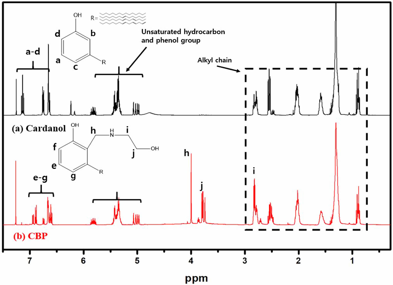 정제 후 얻어진 CBP의 화학적 구조는 1H NMR과 FTIR 분석을 통해 확인하였다. Figure 1(a)의 1H NMR을 통한 분석 결과 카다놀의 방향족 고리의 수소에 대한 특성 피크가 6.5-7.2 ppm에서 관찰되며, 5.3-5.6 ppm에서 불포화 탄화수소 사슬 및 페놀기의 피크를 확인하였다. 또한, 0.7-3.0 ppm에서 카다놀의 불포화 탄화수소 사슬의 피크를 확인하였다.21,22 CBP의 경우 2.5 및 3.5 ppm에서 나타나는 에탄올 아민의 특징 피크가 반응 후, 전자 밀도 감소에 의한 화학적 이동이 발생하여 각각 2.8 및 3.8 ppm에서 확인되었다(Figure 1(b)). 추가적으로 Mannich bridge(Ar-CH2-NH)에 해당하는 피크는 4.0 ppm에서16 관찰되며, 위의 분석을 통해 CBP가 성공적으로 합성되었음을 확인하였다.