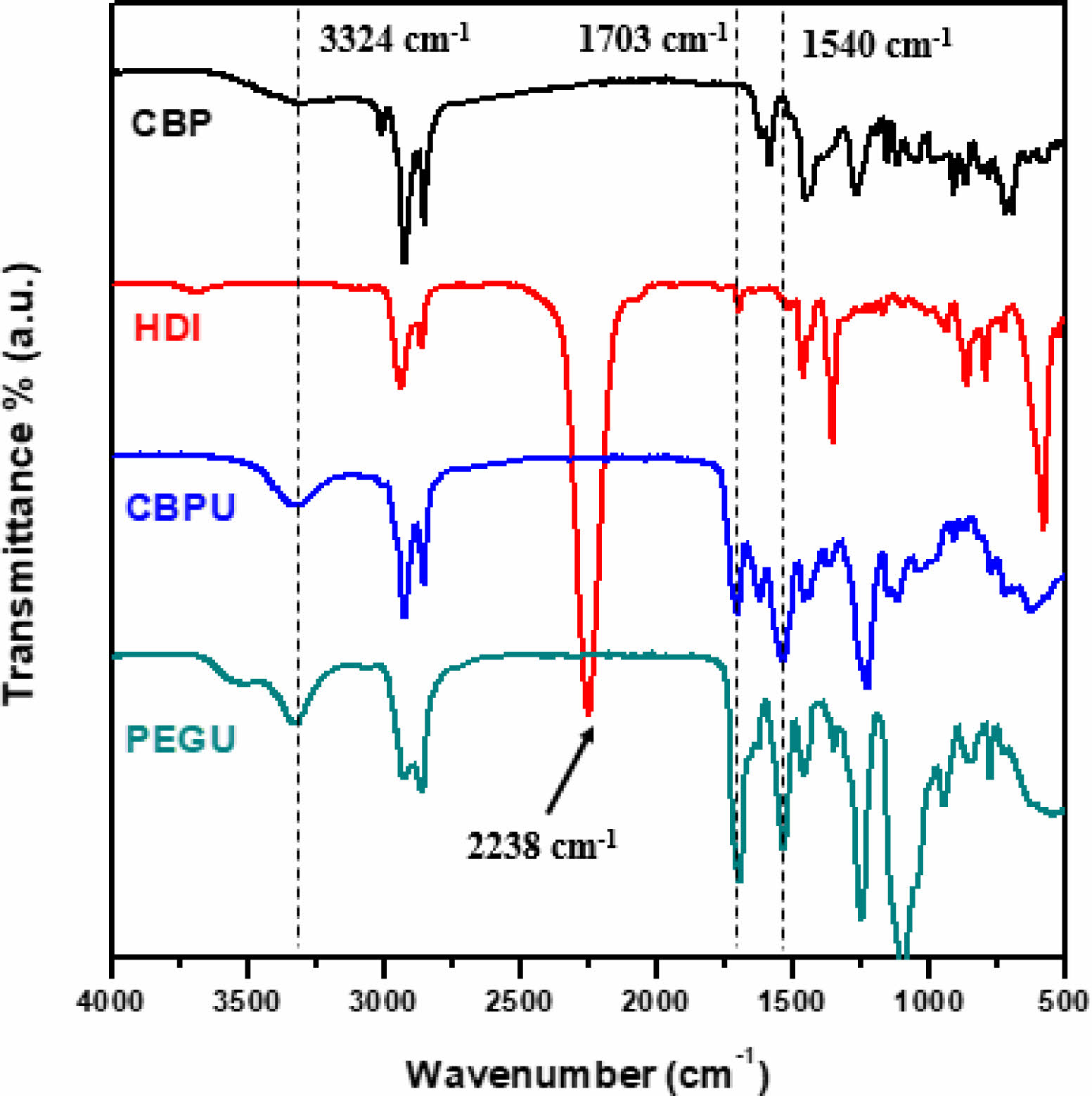 CBPU와 PEGU의 제조는 Figure 3의 FTIR 분석을 통해 확인하였다. CBPU와 PEGU의 FTIR 결과로부터, HDI의 N=C=O 결합을 나타내는 2238 cm-1 피크가 완전히 사라지는 것을 확인할 수 있다. 본 연구에서 과량의 이소시아네이트를 사용한 점을 고려하였을 때, 이는 우레탄 반응과 더불어 알로파네이트 및 뷰렛 형성 반응을 포함하는 부반응이 동시에 진행되었음을 알 수 있다.15 또한, CBPU와 PEGU의 FTIR 결과에서는 우레탄 결합의 형성을 나타내는 N-H stretching과 N-H bending 피크가 각각 3324 cm-1 및 1540 cm-1에서 관찰되었고, C=O stretching 피크가 1703 cm-1에서 관찰되었다. 따라서, CBPU 및 PEGU는 HDI와 CBP 및 PEG 사이의 각각에 대한 우레탄 반응을 통하여 성공적으로 제조되었음을 확인할 수 있었다.