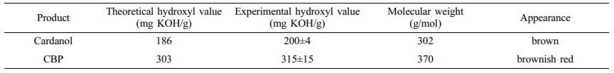 카다놀 기반 바이오 폴리올(CBP) 합성.카다놀 기반 바이오 폴리올인 CBP를 합성하기 위해 카다놀(30.2 g, 0.1 mol), 37% 포름알데히드 수용액(8.1 g, 0.1 mol) 그리고 에탄올아민(6.1 g, 0.1 mol)을 둥근 바닥 플라스크에 투입하고 80 oC에서 환류 상태로 1시간 동안 교반하였다. 이후 온도를 120 oC까지 승온 하여, 환류 냉각관을 제거하고 30분 동안 교반 하였다. 반응 완료 후, EA, MC 및 염수를 사용하여 1차 정제를 진행하고, acetonitrile을 사용한 침전 방법으로 2차 정제를 진행하였다. 이를 통해 초기 카다놀의 무게 대비 48.7%의 수율로 액상의 CBP를 얻었다.
