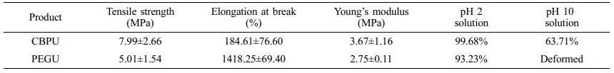 CBPU의 벌크 특성. 기존 연구를 통해 고분자 재료에 방향족 고리화합물과 소수성을 나타내는 불포화 탄화수소 사슬을 포함하고 있는 개질된 카다놀이 도입되었을 경우 재료 고유의 기계적 강도와 내화학성이 향상된다는 것이 이미 알려져 있다.28 본 연구에서도 CBP의 도입에 따른 폴리우레탄 필름의 내화학성 향상을 확인하기 위해 내산 및 내염기성 측정실험을 진행하였다. 이를 위해 20 mm×20 mm×10 mm의 CBPU 및 PEGU 필름 샘플을 각각 준비하였다. 각 샘플을 내산 측정을 위한 pH 2 용액과 내염기성 측정을 위한 pH 10의 각 용액에 24시간 동안 침지한 후 2일 동안 건조하였다. 이때 중량 감소율(%)을 관찰하였으며 그 결과를 Table 3에 나타내었다. 이전 연구에서 폴리우레탄 필름은 산성 수용액에서는 우수한 내구성을 나타내지만, 염기성 수용액에서는 상대적으로 약한 내구성을 지닌 것으로 보고된 바 있다.29 본 연구에서도 산성 수용액(pH 2)에서 PEGU와 CBPU의 두 시료는 각각 93.23% 와 99.68%의 중량을 유지하며 우수한 내산성을 나타냈다. CBPU가 PEGU에 비해 상대적으로 더 우수한 내산성을 나타낸 것은 CBP와 PEG 분자의 화학적 구조차이에 의한 것으로 설명할 수 있다. 친수성이며 선형구조를 가지고 있는 PEG를30 이용하여 제조한 PEGU는 폴리우레탄 내부로 산성 수용액이 침투되는 것이 상대적으로 용이하다. 그러나, 소수성 불포화 탄화수소 사슬을 지니며 분자 구조 내의 방향족 고리화합물을 포함하고 있는 CBP를 이용하여 제조된 CBPU의 경우 산성 수용액이 폴리우레탄 내부로의 침투되는 것을 효과적으로 차단할 수 있기 때문에 상대적으로 높은 내산성을 나타내는 것으로 판단된다.31 또한, 내산성에 비해 CBPU와 PEGU의 낮은 내염기성은 염기조건하에서 폴리우레탄 결합이 갖고 있는 고유의 가수분해에 따른 영향으로 판단된다.32 염기성 수용액(pH 10)에서 PEGU는 완전히 용해되었지만, CBPU는 초기 중량 대비 36.29%의 중량 감소가 발생하였다. 이는 산성 수용액의 결과와 마찬가지로 염기성 수용액에서도 CBP 분자 구조의 영향으로 PEGU에 비해 CBPU가 상대적으로 높은 내염기성을 나타난 것이다. 또한, PEGU의 경우 폴리올로 사용된 PEG는 주사슬이 염기조건하에서 가수분해가 용이한 폴리에테르로 구성되어 있기 때문에 내염기성이 전혀 관찰되지 않은 것으로 판단된다.33 위 결과를 바탕으로 카다놀을 기반으로 제조된 CBPU는 석유계 폴리우레탄 PEGU와 비교하여 산성 및 염기성 수용액 모두에서 내화학성이 향상되는 것을 확인하였다.