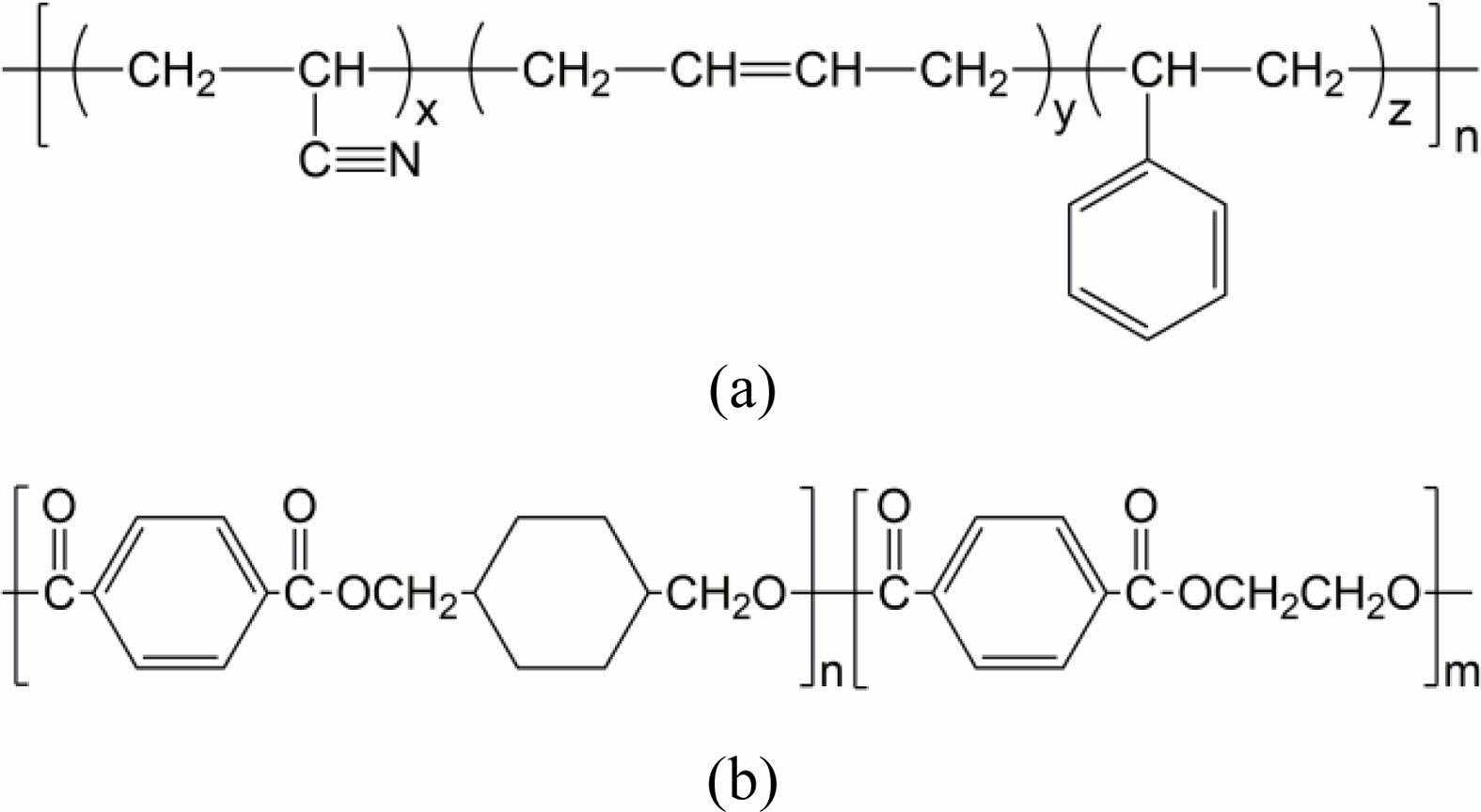 Figure 1 Chemical structures of materials used in this study: (a) ABS; (b) PETG |