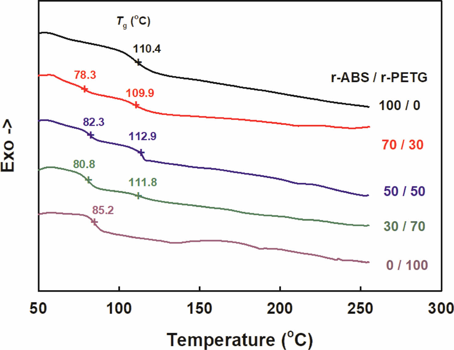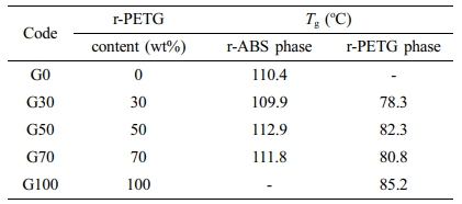 열적 특성. 시차주사열량계(differential scanning calorimeter, DSC, model 2910, TA instrument, U.S.A.)를 이용하여 r-ABS/r-PETG 블렌드의 Tg 변화를 조사하였다. 건조한 시료를 20 oC/min의 속도로 260 oC까지 승온한 후 급속 냉각하였다가 다시 20 oC/min로 260 oC까지 승온하였다.