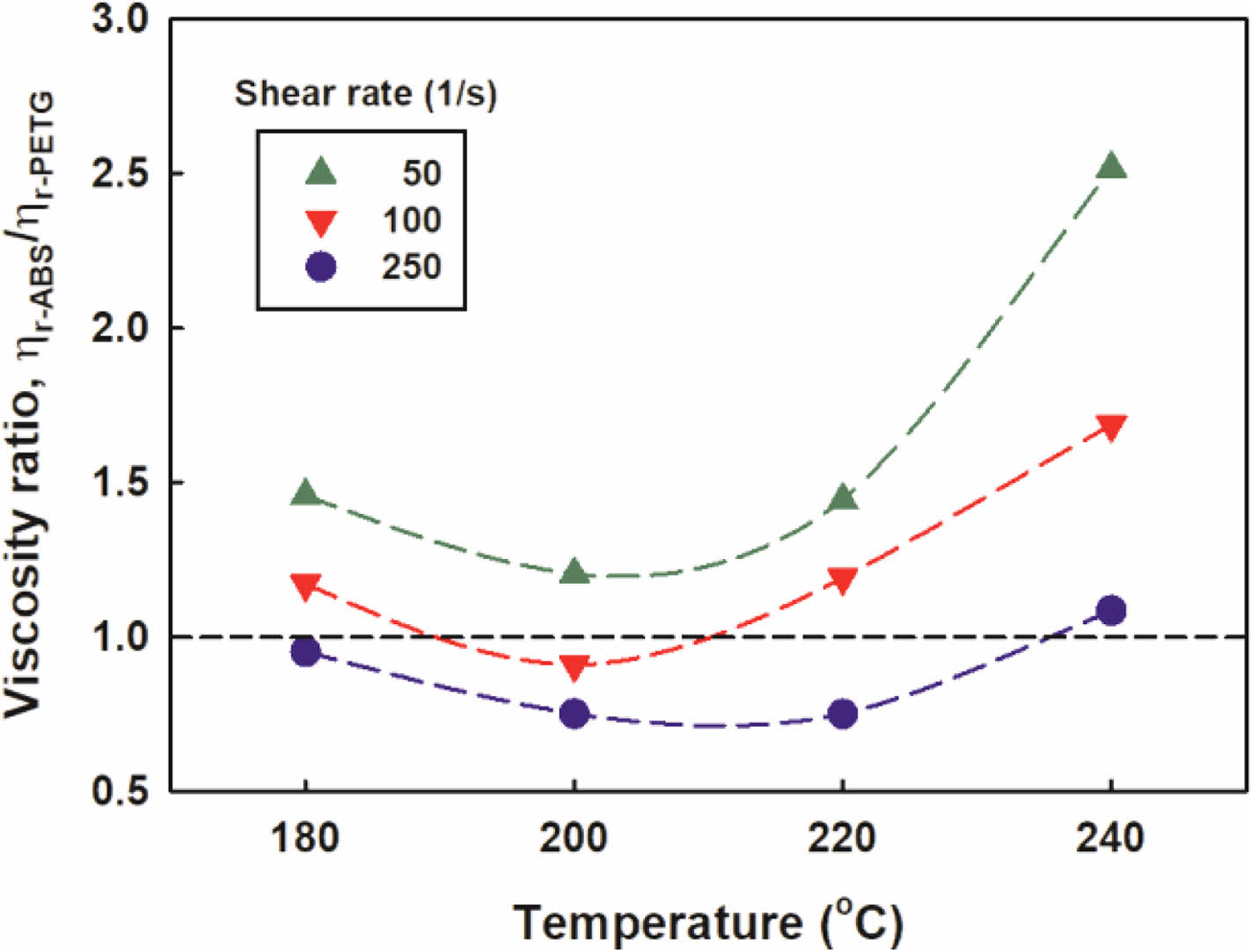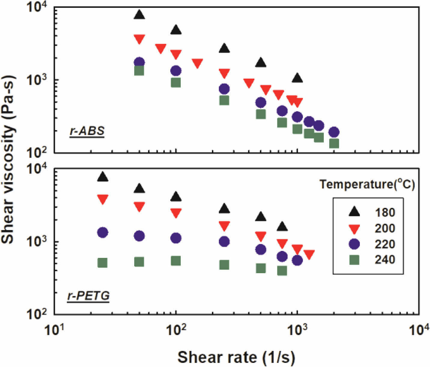 Figure 4 Shear viscosity versus shear rate of r-ABS and r-PETG at different temperatures. |