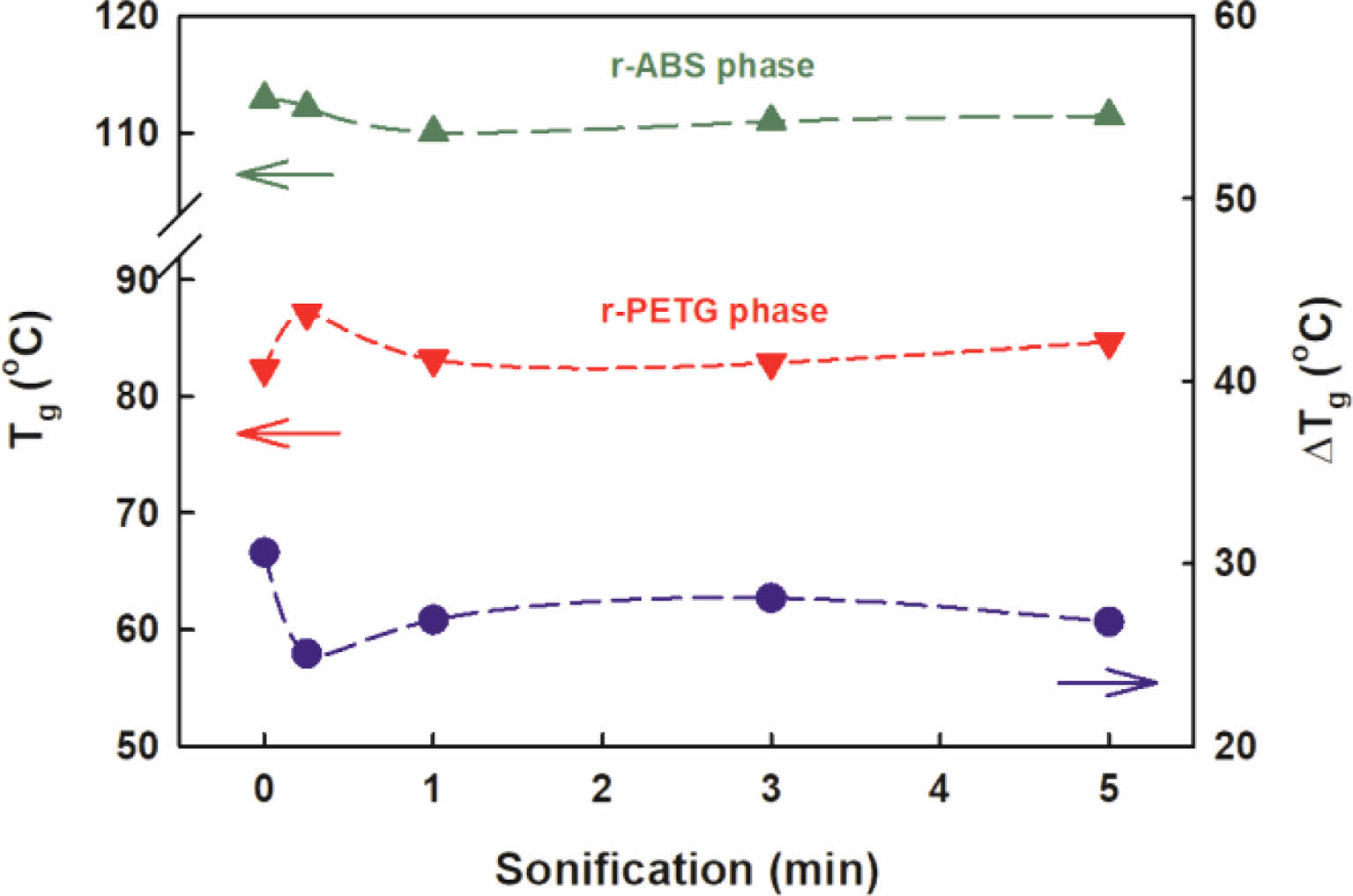 열적 특성. Figure 6에 초음파 가진 시간에 따른 G50에서의 각 상의 Tg 변화를 도시하였다. 위의 두 곡선은 각각 r-ABS상과 r-PETG상의 Tg이고 맨 아래 곡선의 위의 두 곡선의 차 이다. 흥미롭게도 두 Tg 사이의 차이는 15초에서 작아졌다가 초음파 가진 시간이 더 증가함에 따라 다시 증가하였다. 이것은 초음파에 의한 블렌드 계의 상용성을 증가 시키는데 있어서 필요한 최적의 에너지가 있다는 것을 의미하는 바 본 연구에서는 G50에 짧은 시간의 초음파 가진을 한 후 여러가지 물성을 조사하고 최적 가진 시간의 이유를 알아보고자 하였다.
