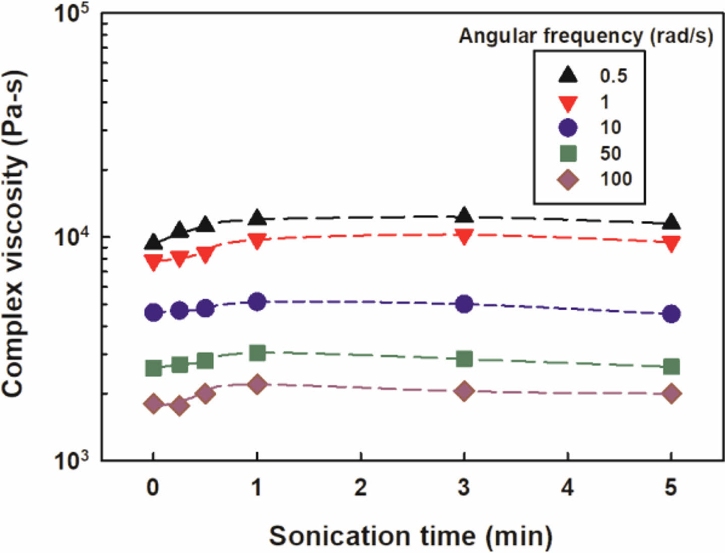 Figure 7 Complex viscosity versus sonication time of G50 at different angular frequencies. |