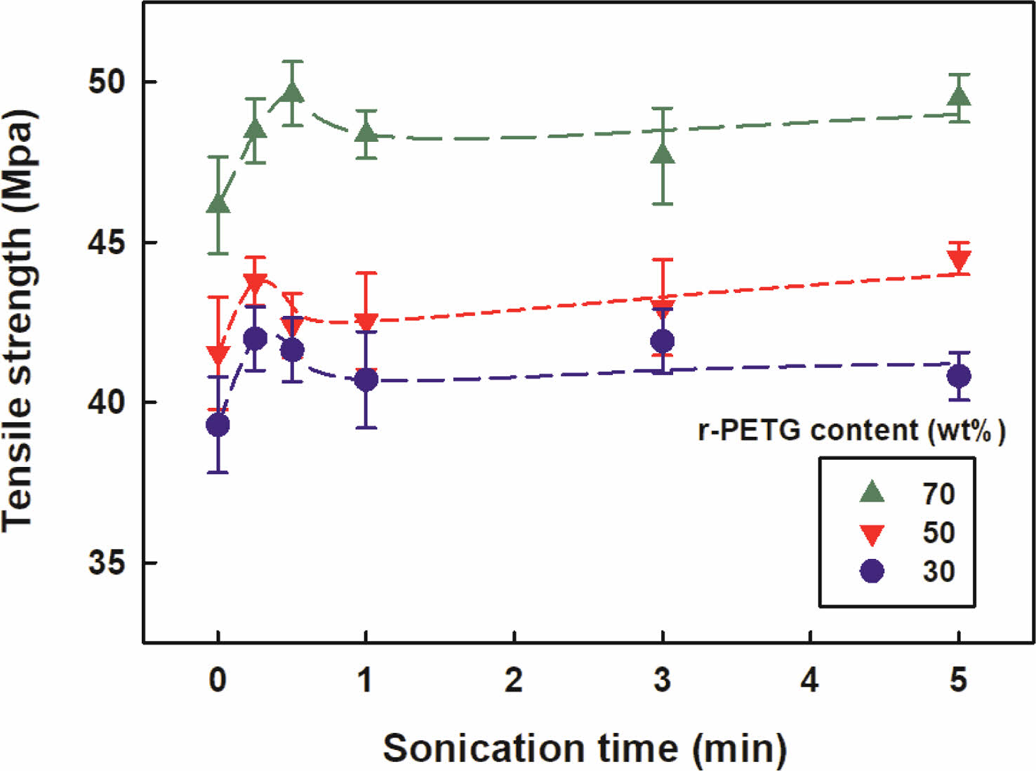 Figure 8 Tensile strength versus sonication time of r-ABS/r-PETG blends at different r-PETG content. |