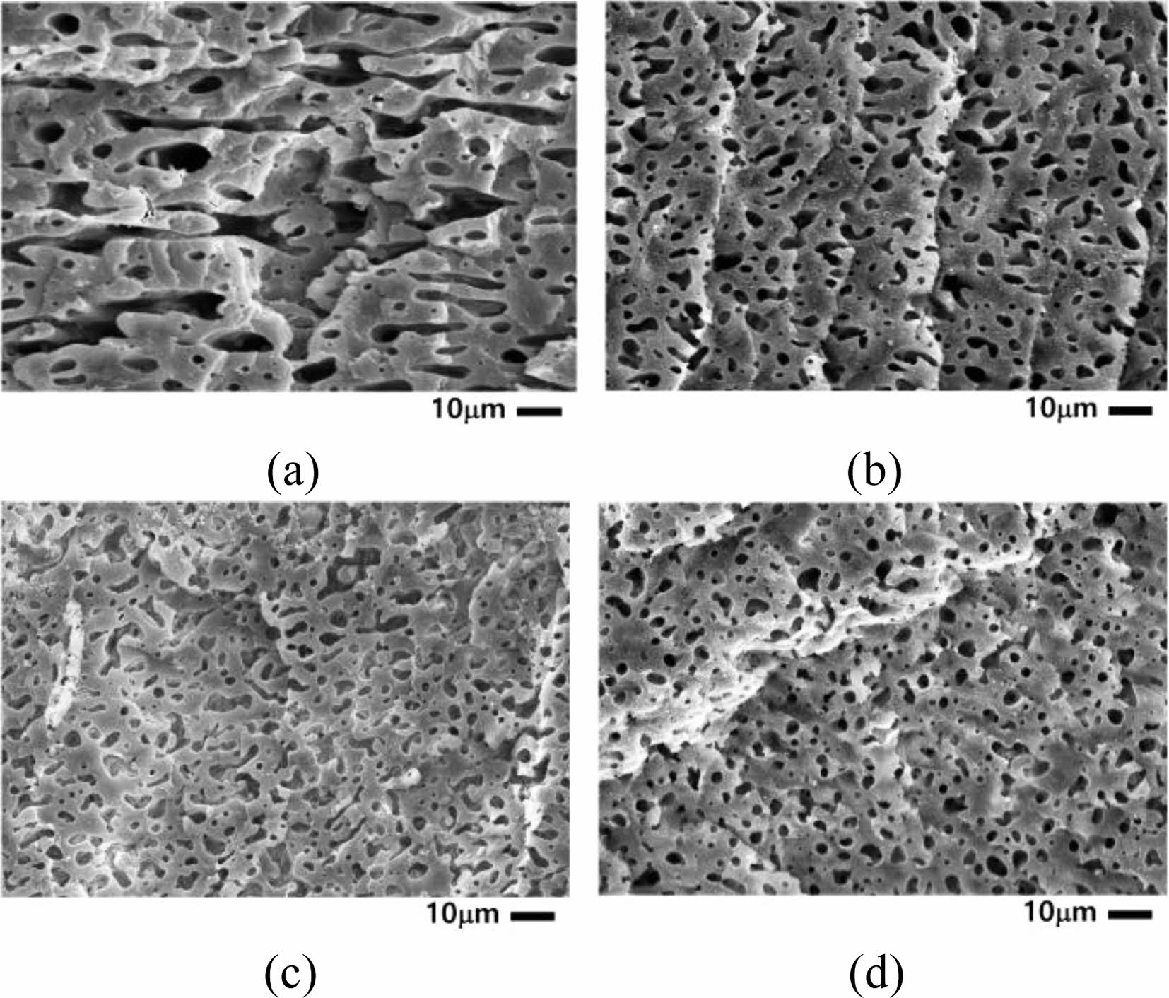 Figure 9 SEM photographs of fractured surface of G60 (×1000). The sonication times are (a) 0 sec; (b) 15 sec; (b) 60 sec; (d) 300 sec. |