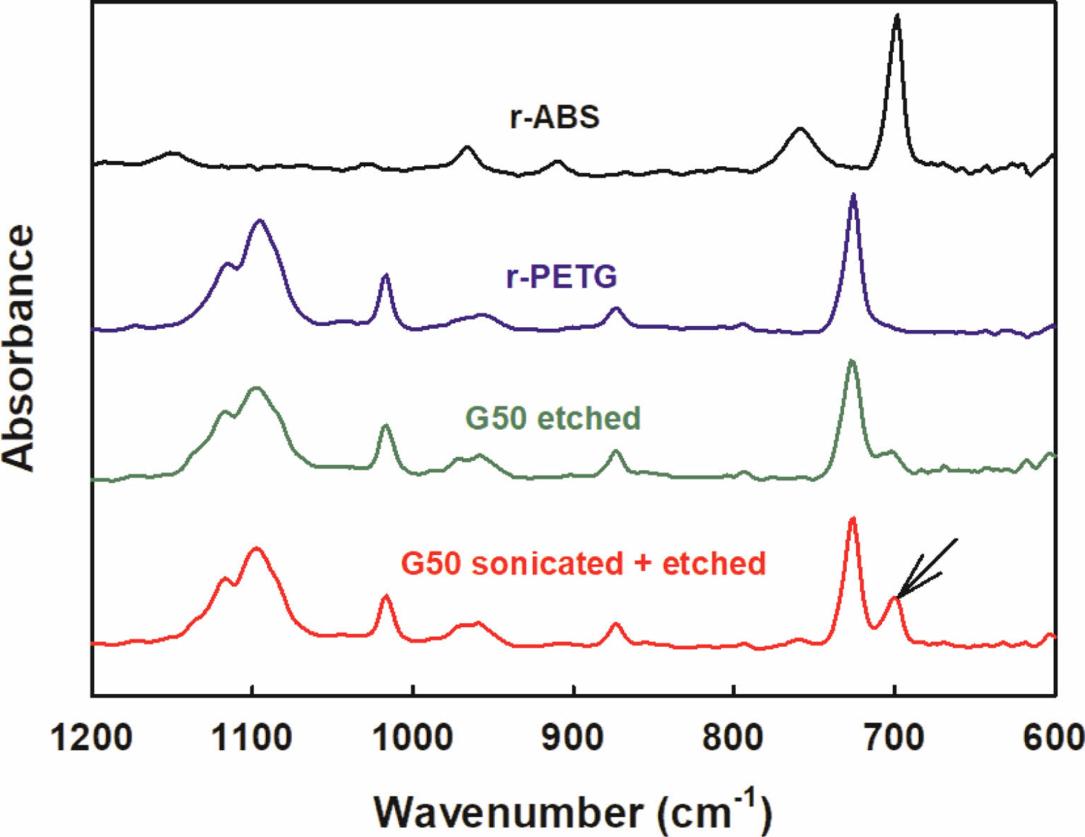 Figure 11 ATR spectra of r-ABS, r-PETG, G50 with and without sonication. |