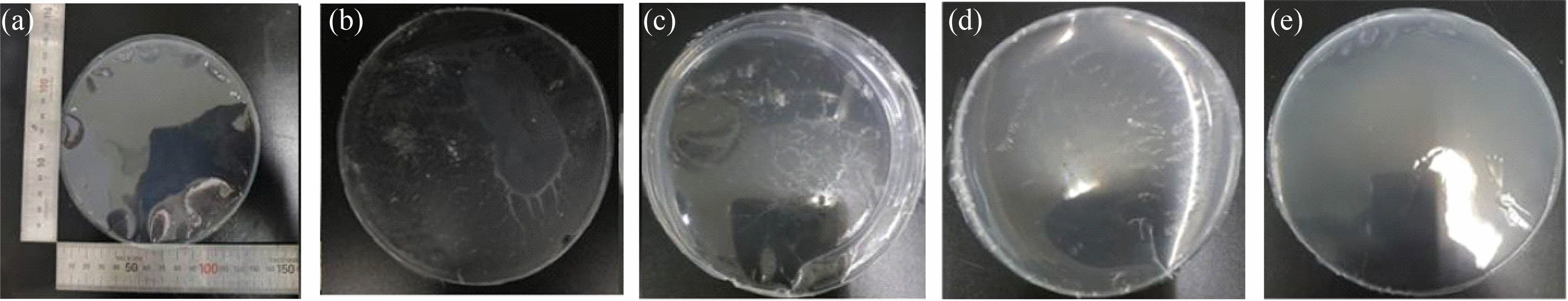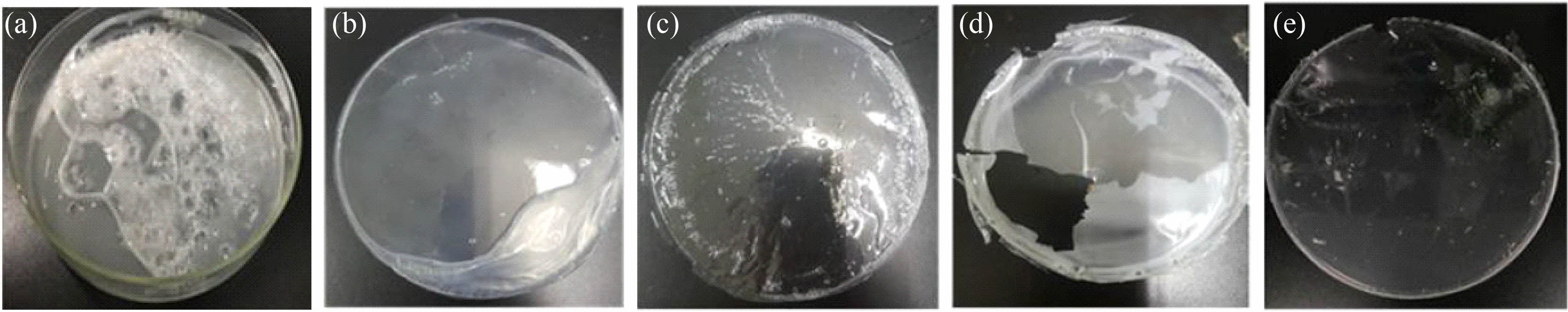 Figure 2 Morphology of prepared PMMA film with various solvents: (a) chloroform; (b) dichloromethane; (c) ethyl acetate; (d) acetone; (e) toluene, size 14π, thickness: 0.17±0.011 mm. |