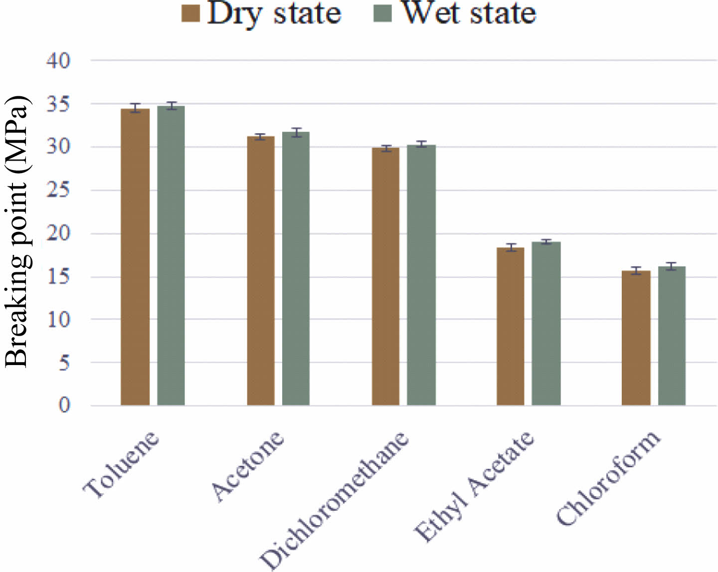 Figure 3 Comparison of breaking point of PMMA film specimens under dry/wet condition with various organic solvent (n=5, p>0.05). Width: 0.5±0.01 cm, Length measurement: 5±0.02 cm. |