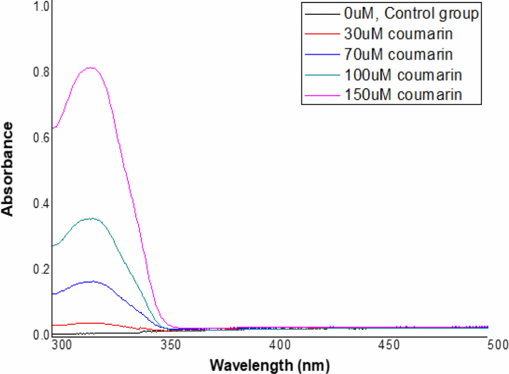 UV/Vis Spectrometer를 이용한 Coumarin 흡광도 측정. Coumarin의 청색광 감소 효과를 확인하기 위해 0, 30, 70, 100, 150 μM 농도의 시편을 UV/vis spectrometer(Jasco V-550, TS science, Korea)를 사용하여 300-500 nm 영역의 청색광 흡광도를 측정하였다. 측정값을 바탕으로 Rambert-Beer 법칙을 적용하여 흡수율을 계산하였다.