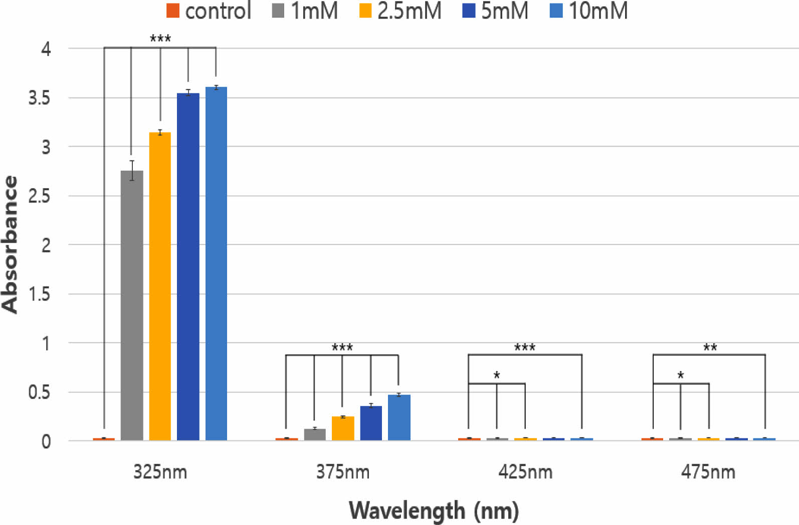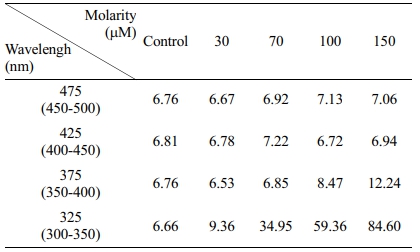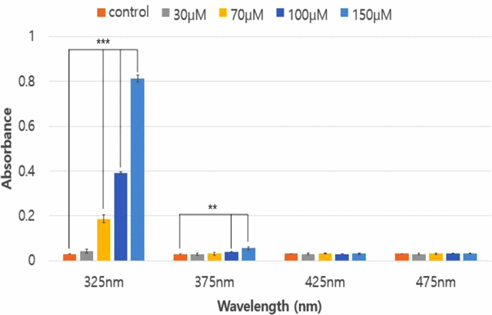 375 nm 구간에서는 70 μM 이상일 때 유의적 차이가 나타났으며, T-test 비교 결과 100, 150 μM 농도에 걸쳐 99.9% 유의적 차이가 나타났다.