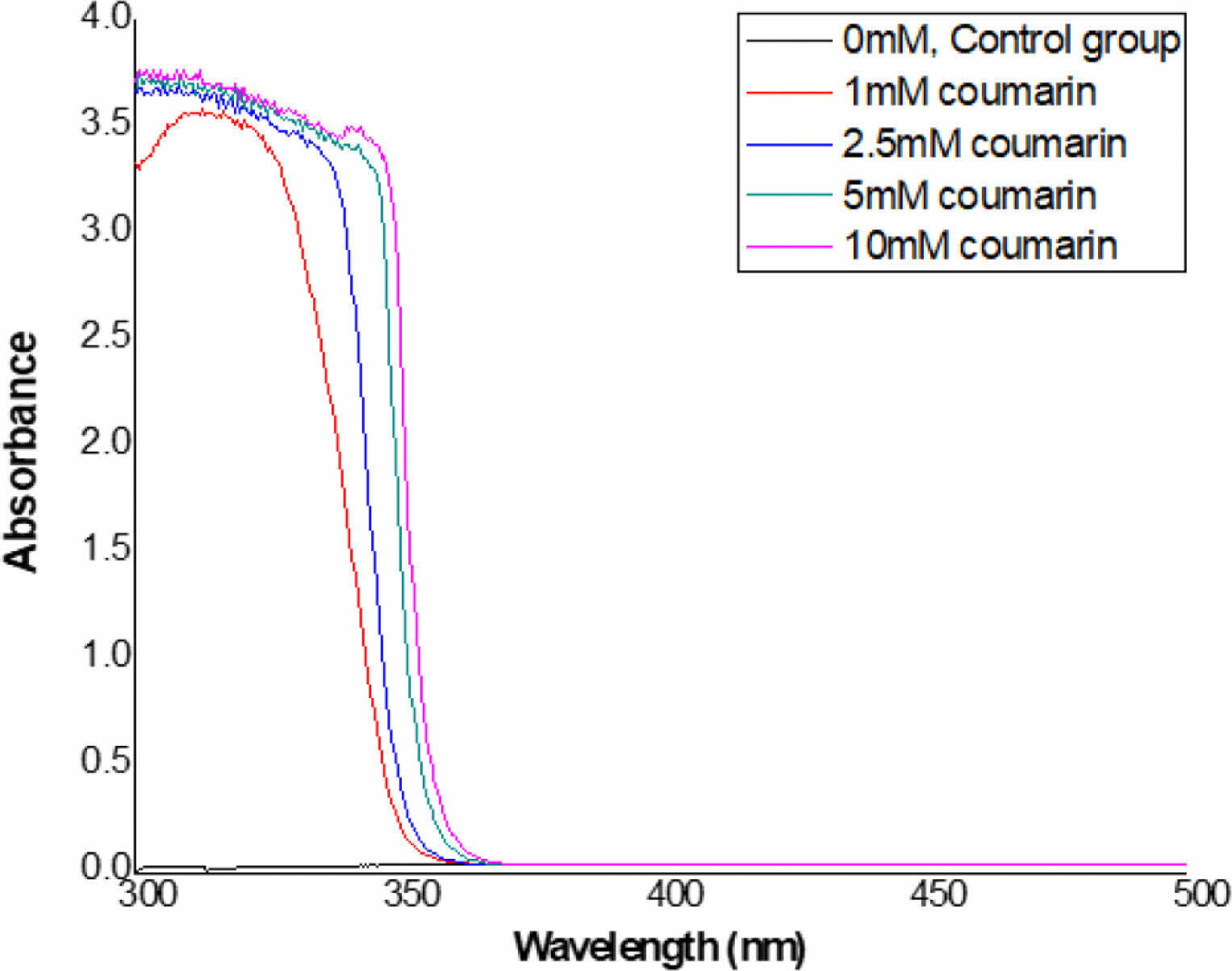 Coumarin의 생물학적 안정성을 고려하여 200 μM 이하의 농도로 제작한 PMMA 필름은 흡광도 측정 결과에서 연구 목표로 설정한 자연광 수준의 청색광 차단효과를 보이지 않았으며, 이에 따라 coumarin 농도를 2.5 mM 이상 사용하였을 시 UV-A(320-400 nm)영역에서 99% 이상의 높은 흡수율을 보였다. 이는 LED 디지털 기기에서 발생하는 청색광을 효과적으로 흡수하여 자연광 수준으로 감소시킨 것을 확인할 수 있다.