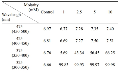 생물학적 안정성을 고려한 몰 농도 비율의 Coumarin 흡광도 분포 및 흡수율 결과. Coumarin의 생물학적 안정성을 고려한 상태에서 측정된 흡광도 분포 및 통계학적 유의성 평가 결과를 Figure 5, Figure 6에 나타내었다. 또한 Rambert-Beer의 법칙에 따라 흡수율을 계산한 결과를 Table 1에 나타내었다. 그 결과 청색광 325 nm 구간에서 coumarin의 농도가 30 μM 이상일 때 유의적 차이가 나타났으며, 100 μM 이상일 때 59% 이상의 흡수율을 보였다.