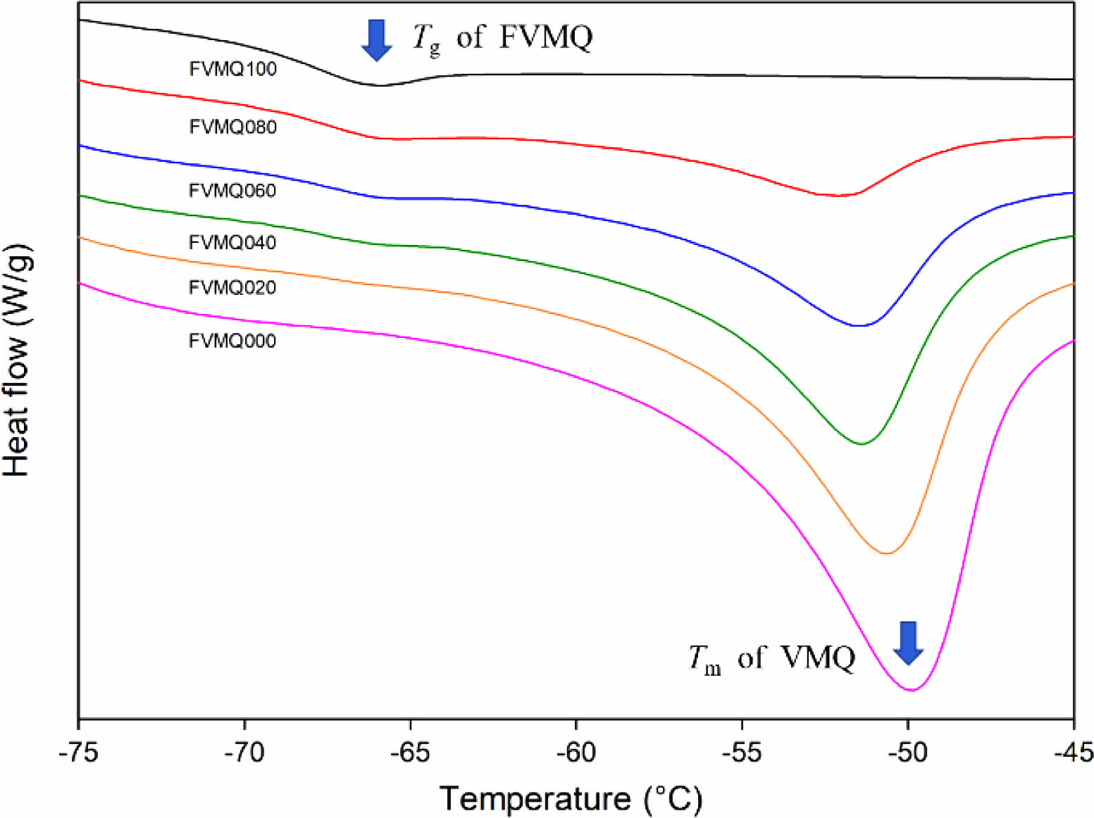 Figure 1 DSC thermograms of FVMQ/VMQ blends. |