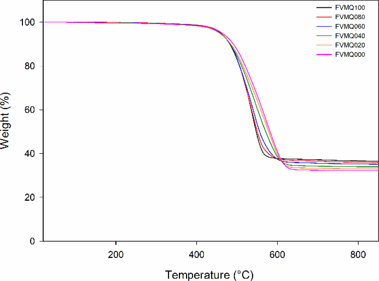 Figure 2 TGA thermograms of FVMQ/VMQ blends. |