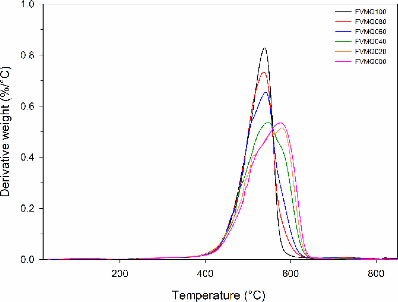 Figure 3 DTG thermograms of FVMQ/VMQ blends. |