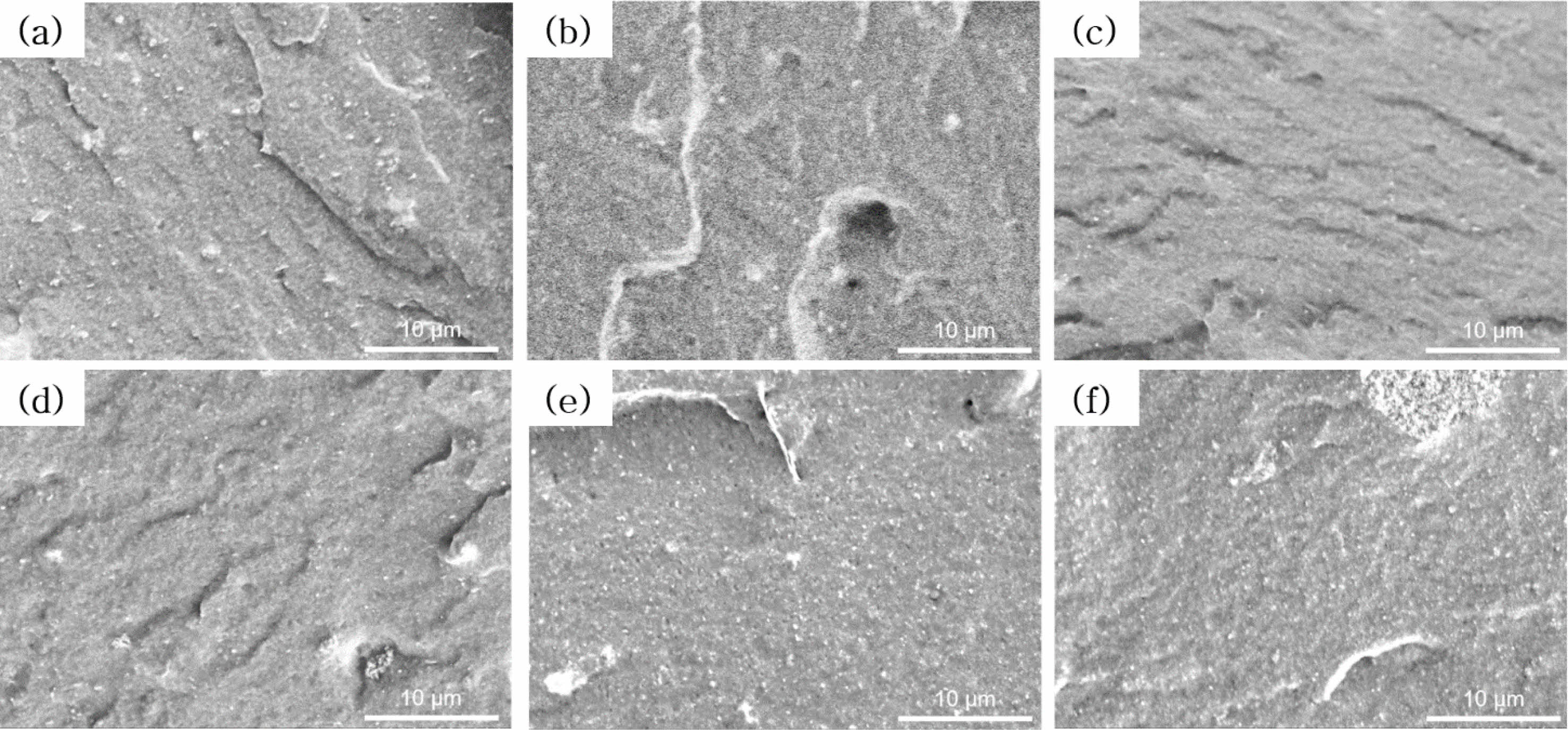 Figure 4 SEM micrographs of fractured surfaces of (a) FVMQ100; (b) FVMQ080; (c) FVMQ060; (d) FVMQ040; (e) FVMQ020; (f) FVMQ000. |