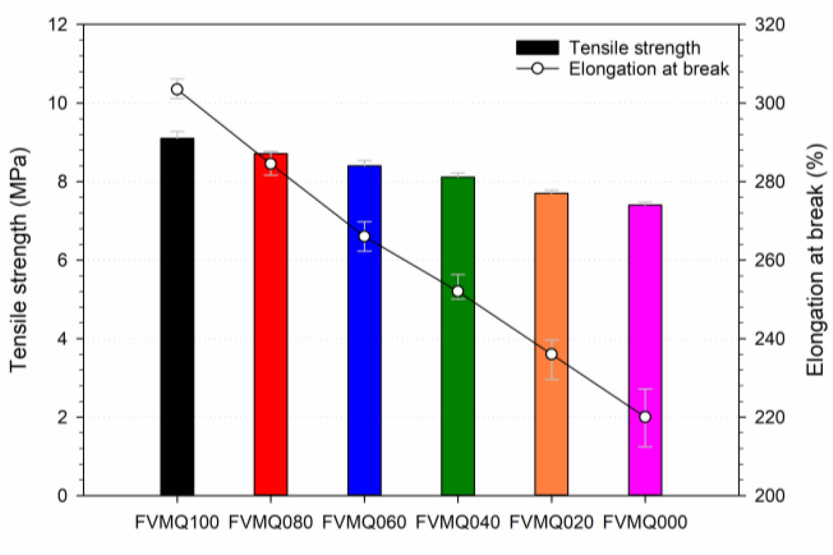 Figure 5 Tensile strength and elongation at break of FVMQ/VMQ blends. |