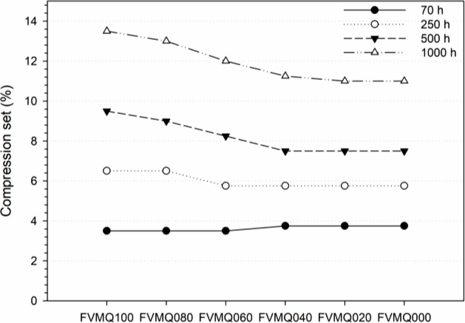 Figure 6 Compression set of FVMQ/VMQ blends after heat aging. |