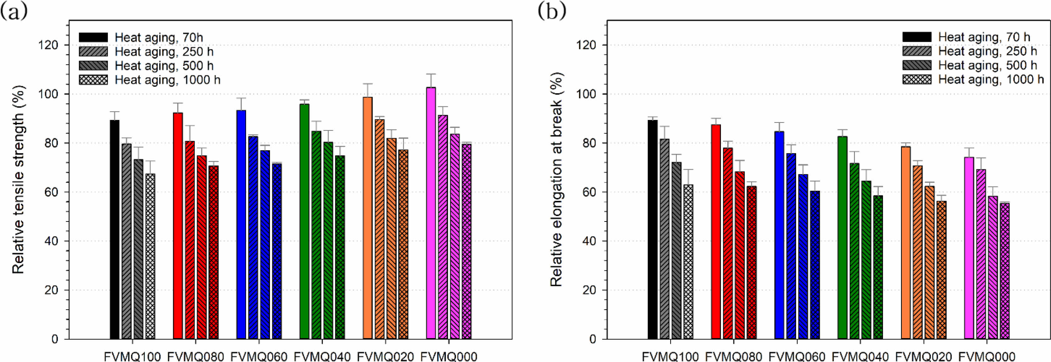 Figure 7 Variation in the mechanical properties in the FVMQ/VMQ blends after heat aging (a) relative tensile strength, and (b) relative elongation at break. |