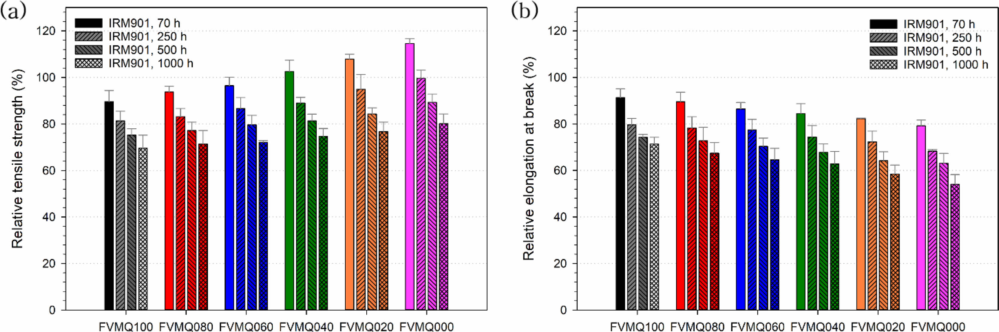 FVMQ의 함량이 80% 이상인 FVMQ100과 FVMQ080의 경우는 IRM 901의 결과가 크게 차이 나지 않으나 VMQ의 함량이 40% 이상인 블렌드에서 이러한 팽윤 효과로 감소의 폭이 점차 증가함을 알 수 있다.