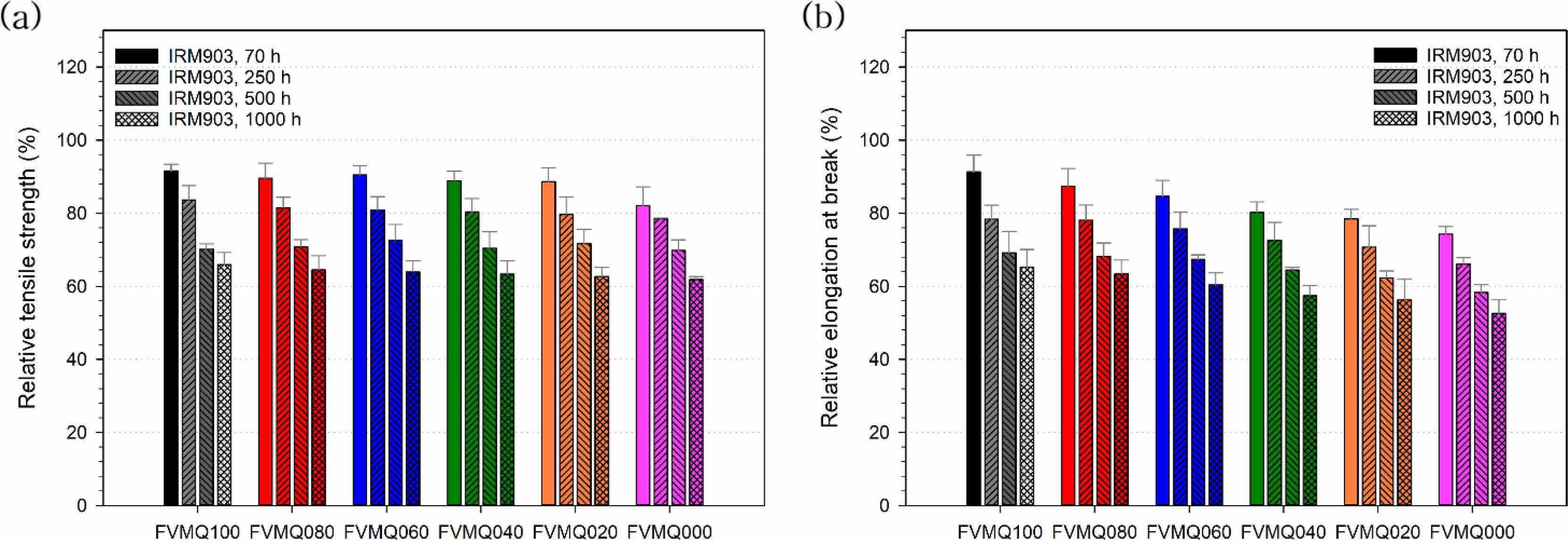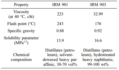 내유 특성.FVMQ/VMQ 블렌드의 함량별 내유 특성을 알아보기 위하여 고무 시편을 제작하여 175 oC에서 각각 70, 250, 500, 1000시간 동안 테스트 오일에 침지시켰다. 그 후 고무 시편에서 테스트 오일을 제거하고 상온에서 한 시간 뒤에 기계적 특성인 시험편의 인장강도 및 파단신율을 측정하여 변화 비율로 나타내었다. 테스트 오일은 IRM 901, IRM 903을 사용하였으며 Table 2에 오일의 특성을 나타내었다.