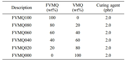 시약 및 재료.본 실험에서 FVMQ와 VMQ는 일본, Shin-etsu사의 FE 271-U, KE 971-U를 사용하였으며, 열에 의해 라디칼을 형성하는 peroxide계 가교제로 Shin-etsu사의 C-8(2,5-dimethyl-2.5-bis(t-butylperoxy)hexane)를 사용하였다.