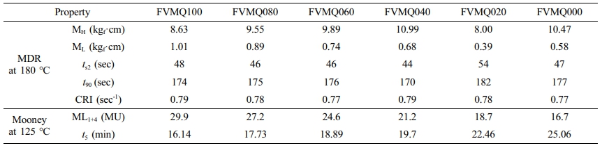 미가교 고무 특성 분석 결과. MDR을 통해서 함량이 각기 다른 FVMQ/VMQ 블렌드의 가교 특성을 측정하였다. Table 3에 MDR 및 무니 점도를 측정한 결과를 나타내었다. ts2과 t90을 측정한 결과를 보면 블렌드별로 그 시간 차이가 10초 이내의 적은 값을 보여주며 CRI로 계산하면 0.77-0.79 사이로 거의 차이가 없음을 알 수 있다. 이러한 결과는 FVMQ와 VMQ를 블렌드 하여도 가교 시스템에는 큰 변화가 없음을 의미하며, 두 고무의 주사슬이 Si-O로 같고 사용되는 가교제 역시 같은 종류의 과산화물(peroxide)을 사용하기 때문으로 볼 수 있다. 또한, 블렌드의 가공성은 ML1+4와 t5를 확인하였을 때 VMQ가 FVMQ보다 점도가 낮아 가공성이 좋으며 블렌드에서 VMQ의 함량이 증가할수록 t5가 증가하고 ML1+4가 감소하므로 가공성이 개선된다.