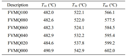 Figure 2와 Table 4에는 FVMQ/VMQ 블렌드의 TGA 데이터를 나타내었다. 함량에 따라 초기 분해 온도인 T10은 482-491 oC이며, 성분 대부분이 분해한 온도인 T60은 566-602 oC이다. 또한, 35% 내외의 잔여물은 시판되는 FVMQ와 VMQ의 충전제인 실리카(silica)이다. VMQ의 함량이 증가할수록 T10, T30, T60 값 모두 높아지는 것을 볼 수 있는데, 이는 상대적으로 열적 성질이 우수한 실리콘 고무의 함량이 증가할수록 내열성이 증가한다는 것을 나타낸다.