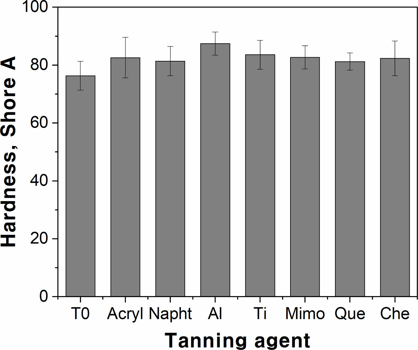 복합소재의 경도.복합소재의 경도 변화를 알아보기 위해 Shore A 경도계를 이용하여 경도를 측정하였고, 비교를 위해 탄닝제로 처리되지 않은 T0도 함께 측정하여 결과를 Figure 1에 나타내었다. T0와 비교하였을 때 탄닝제 종류에 관계없이 모든 샘플에서 경도가 증가하는 것을 확인하였다. 금속 탄닝제의 경도가 비교적 높게 나타났는데, 3가 양이온인 금속 탄닝제는 collagen fiber를 이루고 있는 protein과 cross-linking하여 경도가 증가한 것으로 보인다. 그중 aluminium계 탄닝제가 가장 높은 경도를 나타내었고, 약 16%의 보강 효과를 나타내었다. 다음으로는 합성 탄닝제 중 acryl계와 천연 탄닝제인 Mimosa 탄닝제가 높은 경도 값을 나타내었다. naphthalene계와 Quebracho 탄닝제는 경도 보강 효과가 미미하게 나타났다.