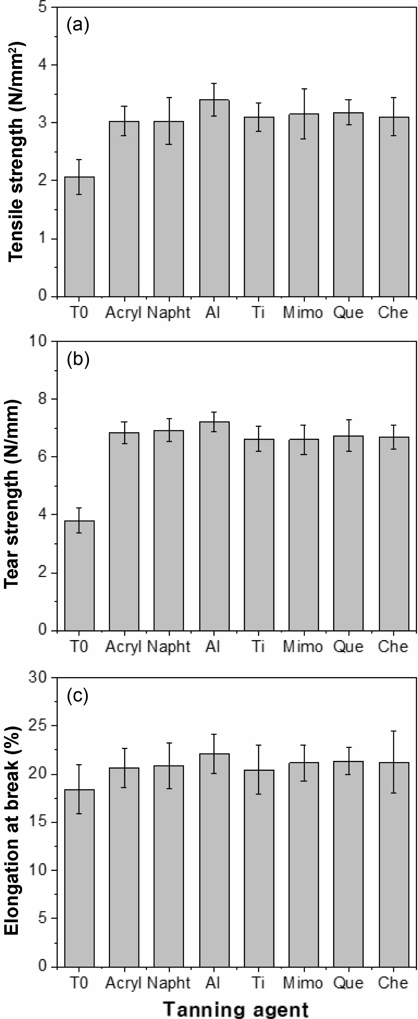 복합소재의 물성 평가. 탄닝제 종류에 따른 복합소재의 인장강도, 인열강도 및 신장률을 측정하여 Figure 3에 나타내었다. 인장강도의 경우 T0와 비교하였을 때 모든 경우에서 50% 이상 증진된 경향을 나타내었다. 계통 별로 비교해볼 때 금속 탄닝제, 천연 탄닝제, 합성 탄닝제 순으로 인장강도가 높은 경향을 나타냈지만 수치상 큰 차이를 보이지 않았다. 그중 aluminium계 탄닝제가 가장 큰 값을 나타냈고, 약 57%의 강도 보강을 나타냈다.