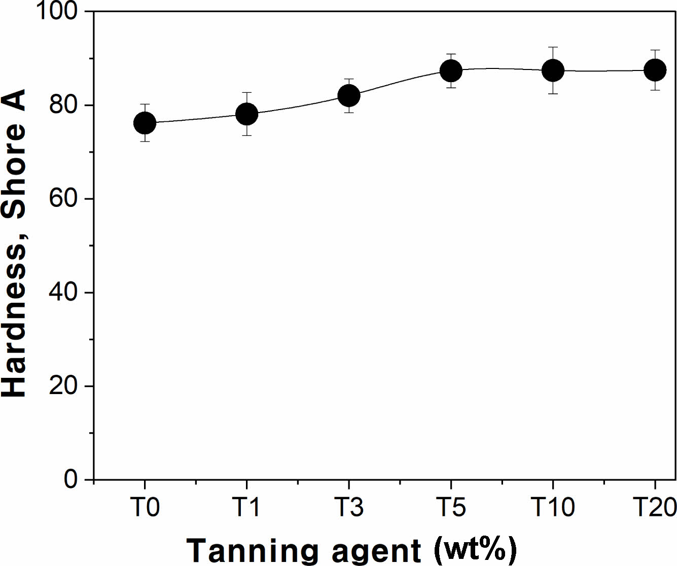 복합소재의 특성 분석.Aluminium 계통의 탄닝제인 Lutan BN이 shaving scrap을 이용한 SBR 복합소재의 보강성 충진제로 사용하기 가장 적합한 것으로 분석되어 Lutan BN 탄닝제의 함량(1-20 wt%)에 따른 복합소재의 특성을 조사하였다. 먼저 경도 변화를 알아보기 위해 Shore A 경도계를 이용하여 경도를 측정하여 Figure 4에 나타내었다. T0와 비교하였을 때 탄닝제의 함량이 증가할수록 경도의 보강 효과가 있는 것으로 확인하였는데, T1과 T3에서는 경도의 보강 효과는 10% 이하로 미미하게 나타났다.