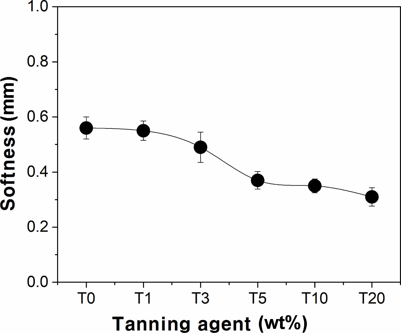복합소재의 유연성 평가.Softness tester를 이용하여 유연성 변화를 측정하였고, 그 결과를 Figure 2에 나타내었다. T0와 비교하면 탄닝제의 종류와 관계없이 유연성이 감소한 것을 확인하였다. 금속 탄닝제를 처리한 복합소재의 유연성이 큰 폭으로 저하되는 경향을 나타냈으며, 천연 탄닝제, 합성 탄닝제 순으로 유연성이 낮게 나오는 경향을 확인하였다.