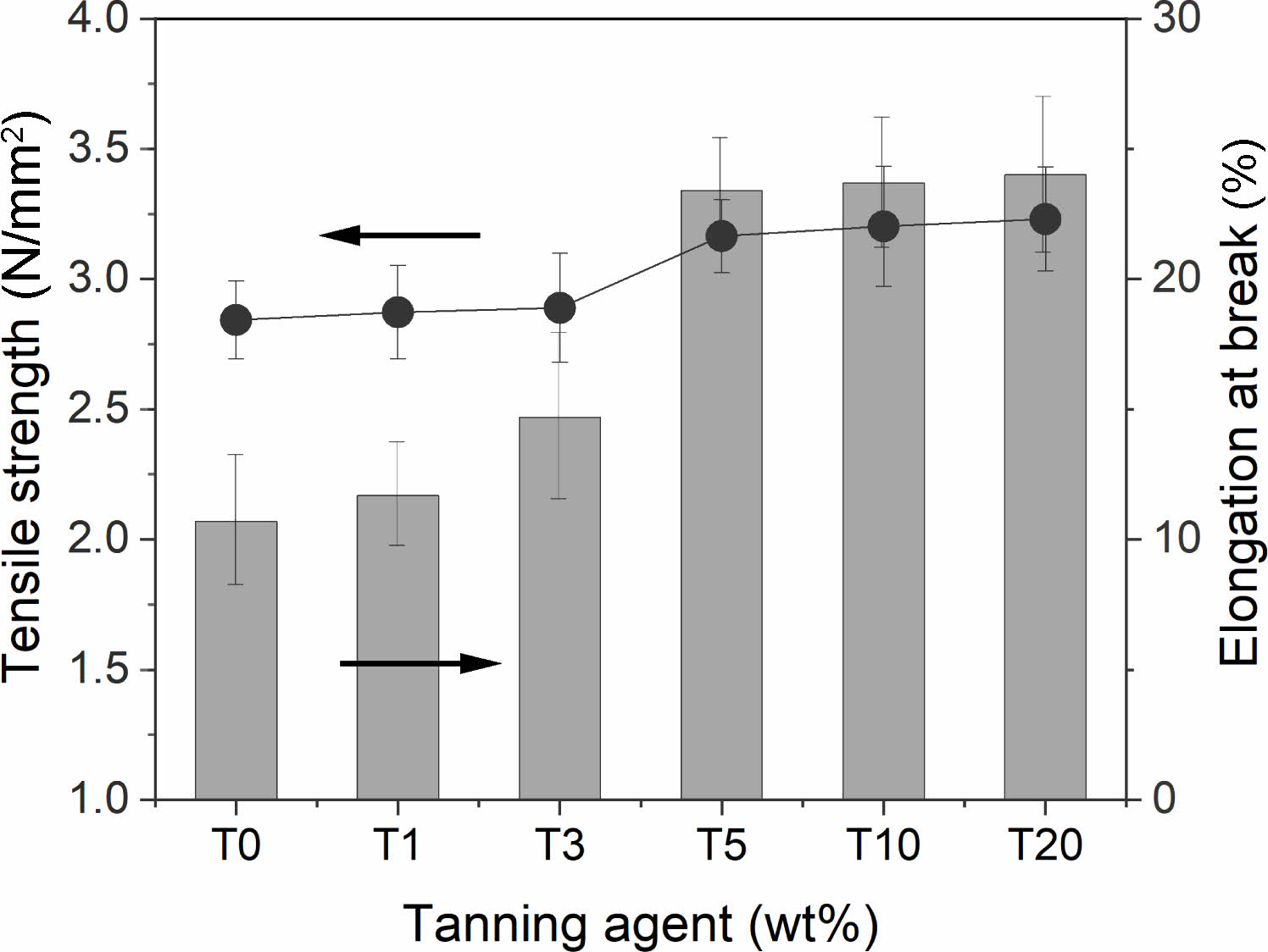 탄닝제 종류에 따른 결과는 T0에 비하여 모두 일정한 수준 이상으로 물성이 증진되는 것을 확인하였다. 탄닝제 종류와 관계없이 물성이 보강되는 것은 각각의 탄닝제가 콜라겐 섬유와 반응하여서 공유 가교 결합을 형성하거나 protein 말단의 극성기에 추가적인 수소결합을 생성하기 때문에 복합소재에서 콜라겐 섬유 내부 결합력이 증가한 결과로 나타나는 것으로 판단되었다. 그 결과 경도가 증가하여 신장률 또한 감소할 것이라 예상한 것과 달리 가교결합 또는 수소결합에 의한 chemical bond를 형성하여 증가한 것으로 판단된다.20