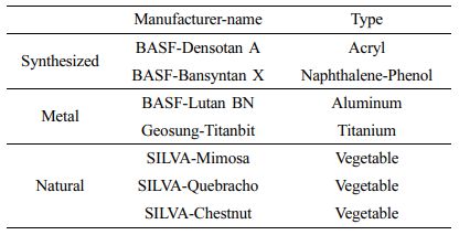 탄닝제는 합성 탄닝제, 금속 탄닝제 및 천연 탄닝제로 구분되며, 합성 탄닝제는 acryl계의 Densotan A(acryl, Germany)와 naphthalene-phenol계의 Basyntan X(napht, Germany)을 사용하였고, 금속 탄닝제로는 aluminum계의 Lutan BN(Al, Netherlands)과 titanium계의 Titanbit(Ti, Geosung, Korea)을 사용하였다. 천연 탄닝제(SILVA, Italy)는 vegetable계인 Mimosa(Mimo), Quebracho(Que) 및 Chestnut(Che)를 사용하였다(Table 1).