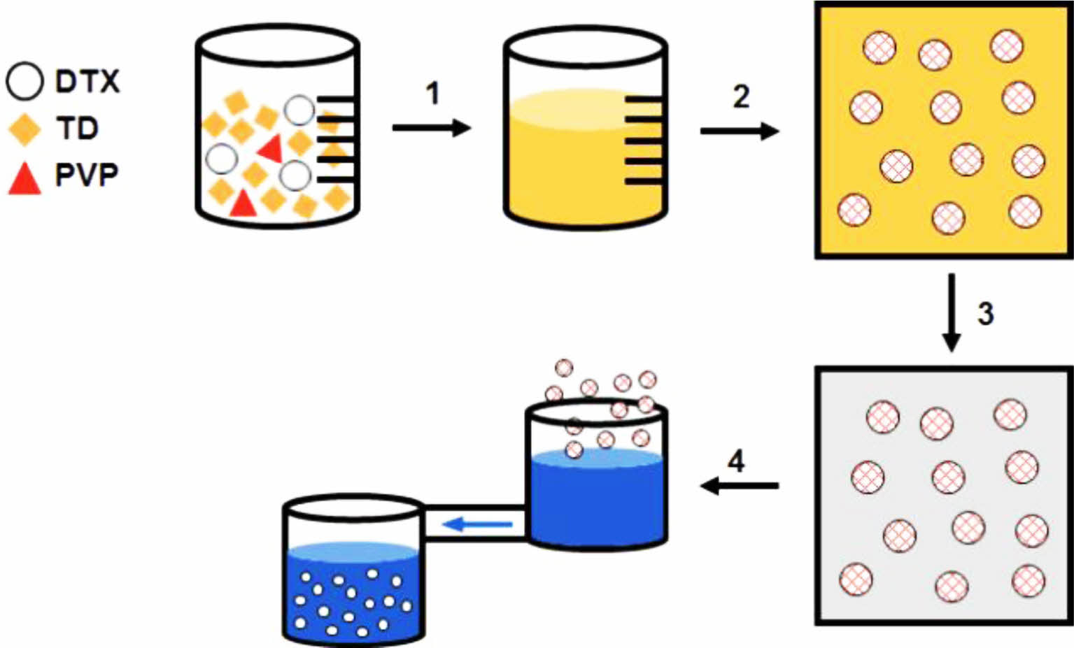 Schematic of DTX nanocrystal formation: (1) melting; (2) cooling; (3) TD extraction; (4) HPH.