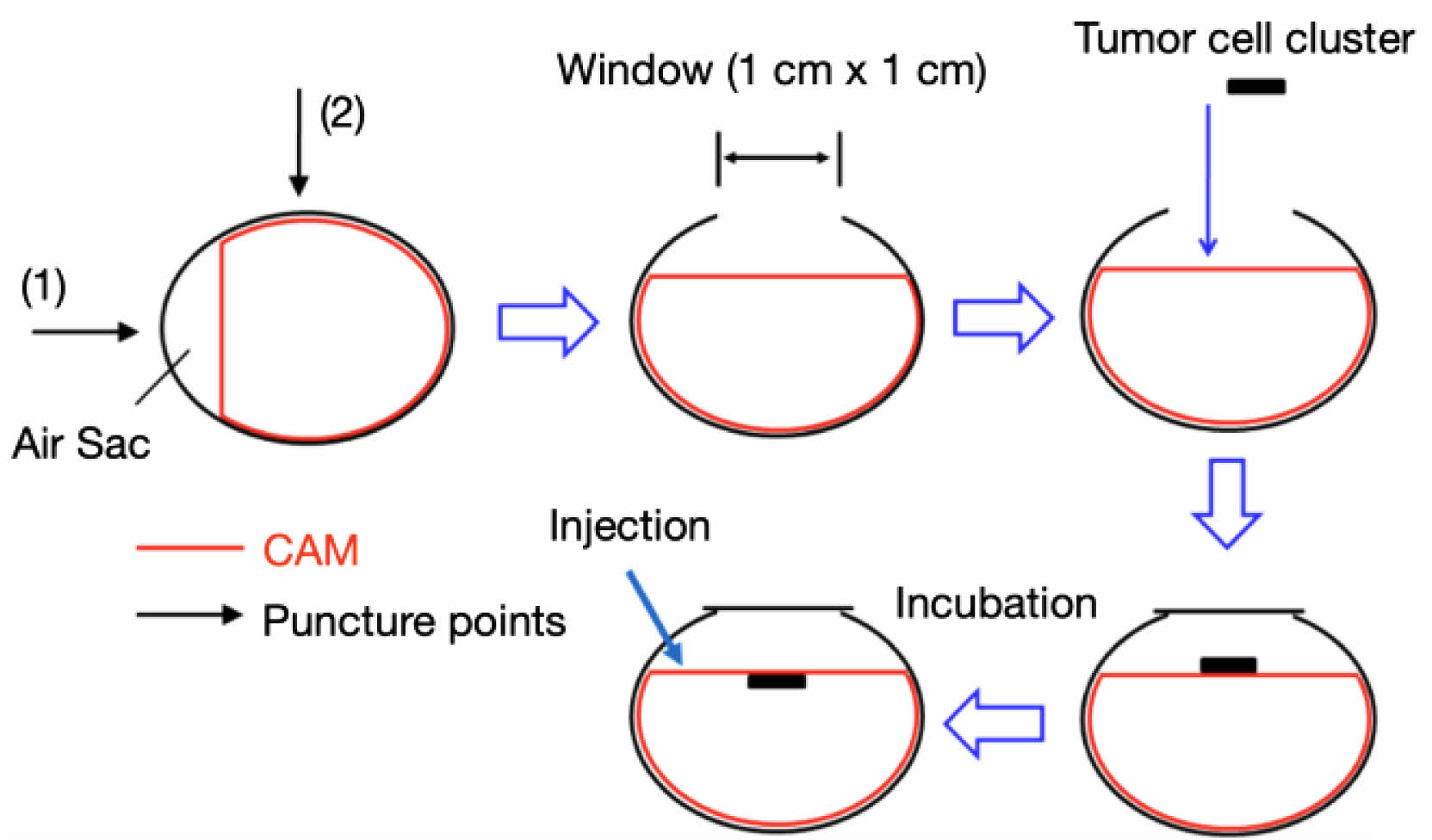 먼저, 유정란을 상대습도 50%, 37 ºC 환경의 배양기에서 7일 동안 배양하였다. 7일차에 각 유정란에 작은 구멍(window, 1 cm×1 cm)을 내고 CAM 혈관 형성을 관찰하였다. 혈관 형성이 충분히 진행된 11일차에 콜라겐 세포외기질로 봉입한 tumor cell cluster를 CAM에 이식하였다. CAM 위에서 암 조직 형성 및 신생 혈관 생성이 확인된 14일차에 DTX 나노결정을 20 μg/kg 농도로 투여하고 CAM에 발현된 암 조직의 변화를 관찰하였다. 대조군 실험으로는 도세탁셀을 ethanol/polysorbate 80(1:1 v/v)에 녹여 제조한 용액을 PBS(phosphate buffered saline)에 희석하여 같은 농도로 투여하였다. 관찰이 끝난 CAM은 18일차에 4% 포름알데하이드(formaldehyde in PBS, Sigma) 용액으로 고정시켰다. 고정 후 유정란에서 CAM을 가위로 절제하여 샘플링하고 H&E 염색(hematoxylin & eosin staining)을 통한 조직분석을 수행하였다.