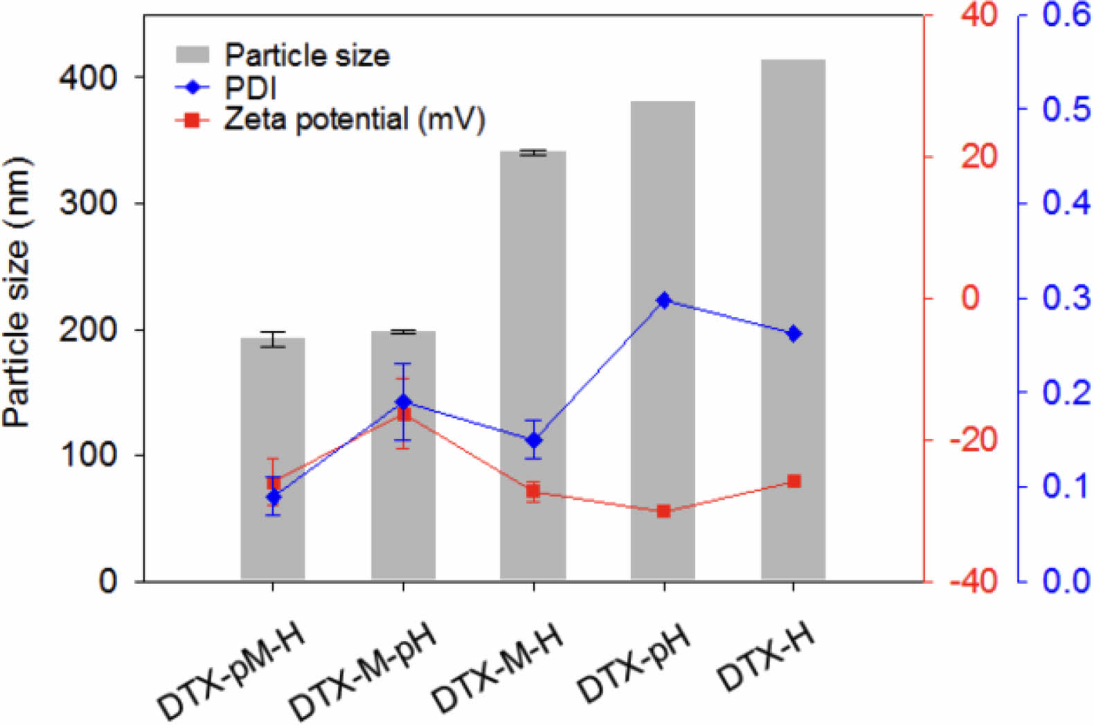 도세탁셀 결정 입자와 공정 변수. Table 1에 제시된 공정 조건 변화에 따라 제조된 DTX 결정의 입자 크기(particle size), 다분산지수(polydispersity index, PDI), 제타전위(zeta potential)를 Figure 4에 나타내었다. 입자 크기는 DTX-pM-H이 192.8 nm로 가장 작았으며, DTX-M-pH, DTX-M-H, DTX-pH, DTX-H의 순서대로 증가하여 각각 198.0, 340.7, 381.3, 414.1 nm 크기를 보였다. 다분산지수 또한 DTX-pM-H가 0.09로 가장 작은 값을 가지며, DTX-M-pH, DTX-M-H, DTX-pH, DTX-H는 각각 0.19, 0.15, 0.26, 0.30의 값을 보였다. 제타 전위의 경우 DTX-M-pH을 제외한 모든 경우에 -25 mV보다 작은 값을 보였으므로, 대체적으로 안정적인 분산이 이루어진 것으로 평가할 수 있었다. 참고로 DTX-pM-H, DTX-M-pH, DTX-M-H의 경우에는 세 번의 독립적인 실험 결과에 따른 표준편차를 각 물성값에 대해서 표시하였다. DTX-pH와 DTX-H의 경우에는 입자 크기와 다분산지수가 목표값보다 모두 현저히 커서 1회 실험 후 최적화 후보에서 제외하였다. 결론적으로 DTX-pM-H의 경우에 가장 작고 균일한 DTX 결정 입자가 생성되었으며, 1년 후에 입자 크기를 재측정한 결과 196.0 nm의 값을 보여 장기보관 안정성 또한 확인하였다.