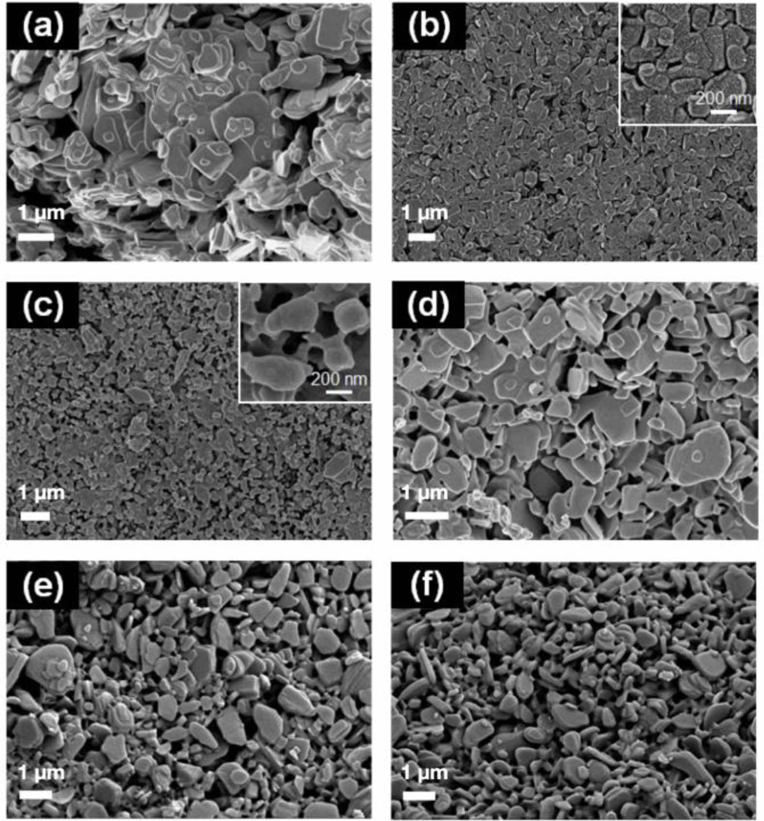 도세탁셀 결정 입자의 형태와 결정학적 분석. 수분산된 시료를 여과한 후 초순수로 세척하고 건조하여 얻은 결정을 SEM으로 분석한 결과를 Figure 5에 나타내었다. DTX 원료 (Figure 5(a)) 입자는 둥근 모서리를 지닌 판 형태를 지니고 있으며 입자 크기 분포가 매우 큰 것을 알 수 있었다. DTX-pM-H(Figure 5(b)) 입자는 원료와 비슷한 모양으로 200 nm 정도의 크기를 지니며 분포가 상당히 균일하였다. DTX-M-pH(Figure 5(c)) 입자 또한 약 200 nm의 크기였으나, 입자 사이의 응집이 많은 부분에서 관찰되었다. 이러한 경향은 Figure 4의 입도 분석 결과와 일치하는 양상이다. DTX-M-H, DTX-pH, DTX-H(Figure 5(d)-(f)) 입자들은 상당히 큰 크기와 크기 분포를 지니고 있는데, 역시 입도 분석 결과와 일치하는 양상이다.