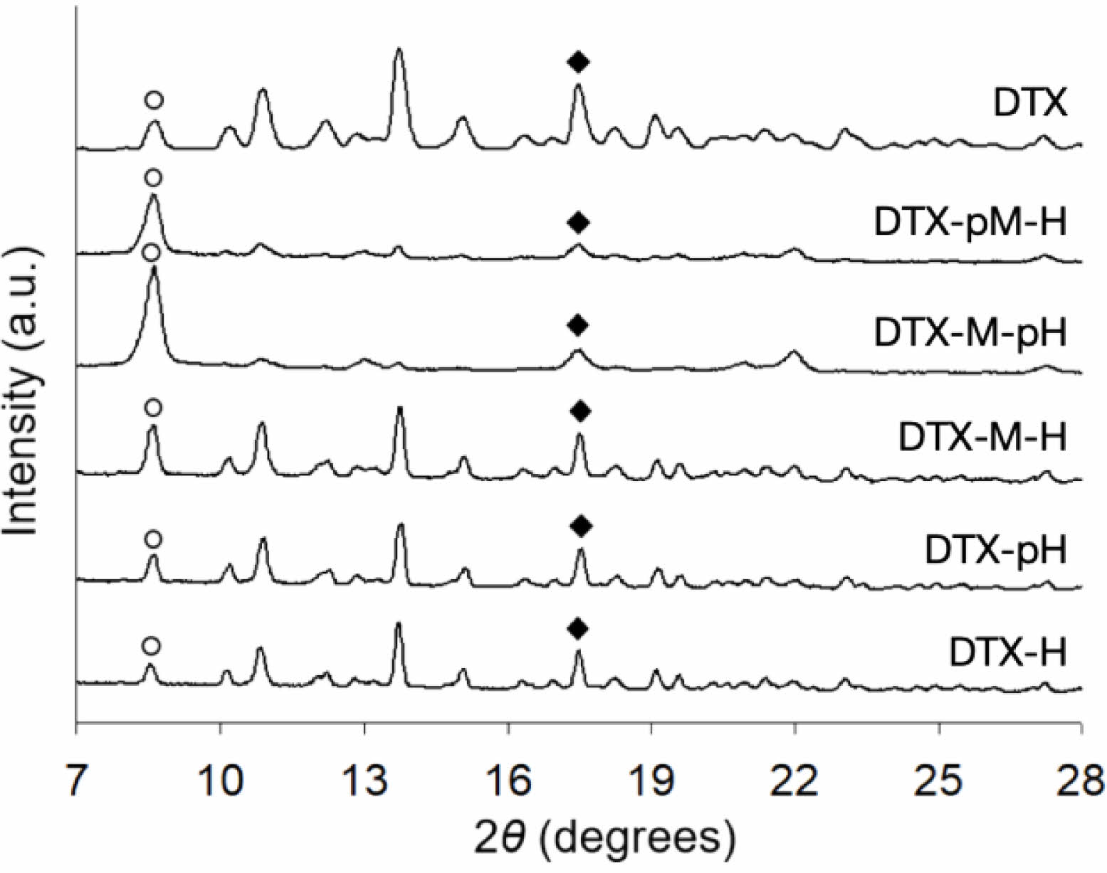 수분산된 시료를 여과한 후 초순수로 세척하고 건조하여 얻은 결정을 XRD로 분석한 결과를 Figure 6에 나타내었다. 전반적으로 회절 피크의 위치에는 변화가 없으므로 결정형은 원료인 도세탁셀 삼수화물이 그대로 유지되는 것을 알 수 있다. 하지만 회절 피크의 상대적인 크기는 원료와 상당한 차이를 보이는데, 특히, 8.6도의 (400)면 회절 피크와 17.5도의 (121)면 회절 피크의 크기 변화를 통해 결정 형태와의 상관 관계를 분석할 수 있다.18,19 8.6도의 (400)면 회절 피크는 얇은 판상의 모양을 지닌 DTX-pM-H와 DTX-M-pH에서 상대적으로 강하게 나타났으므로, 형성되는 DTX 결정의 평평한 면이 결정 구조의 a축에 수직한 것으로 판단할 수 있다. 또한 17.5도의 (121)면 회절 피크는 (400)면과 약 83도의 각도로 엇갈려 있고 두께 관측이 상대적으로 용이한 DTX 원료, DTX-M-H, DTX-pH, DTX-H 등에서 강하게 나타났기 때문에 결정의 두께와 비교적 평행한 것으로 추정할 수 있다.18 결국 XRD 회절 피크의 상대적인 크기 변화는 SEM을 통해서 관측한 결정의 모양과 일치하는 경향을 보였다.