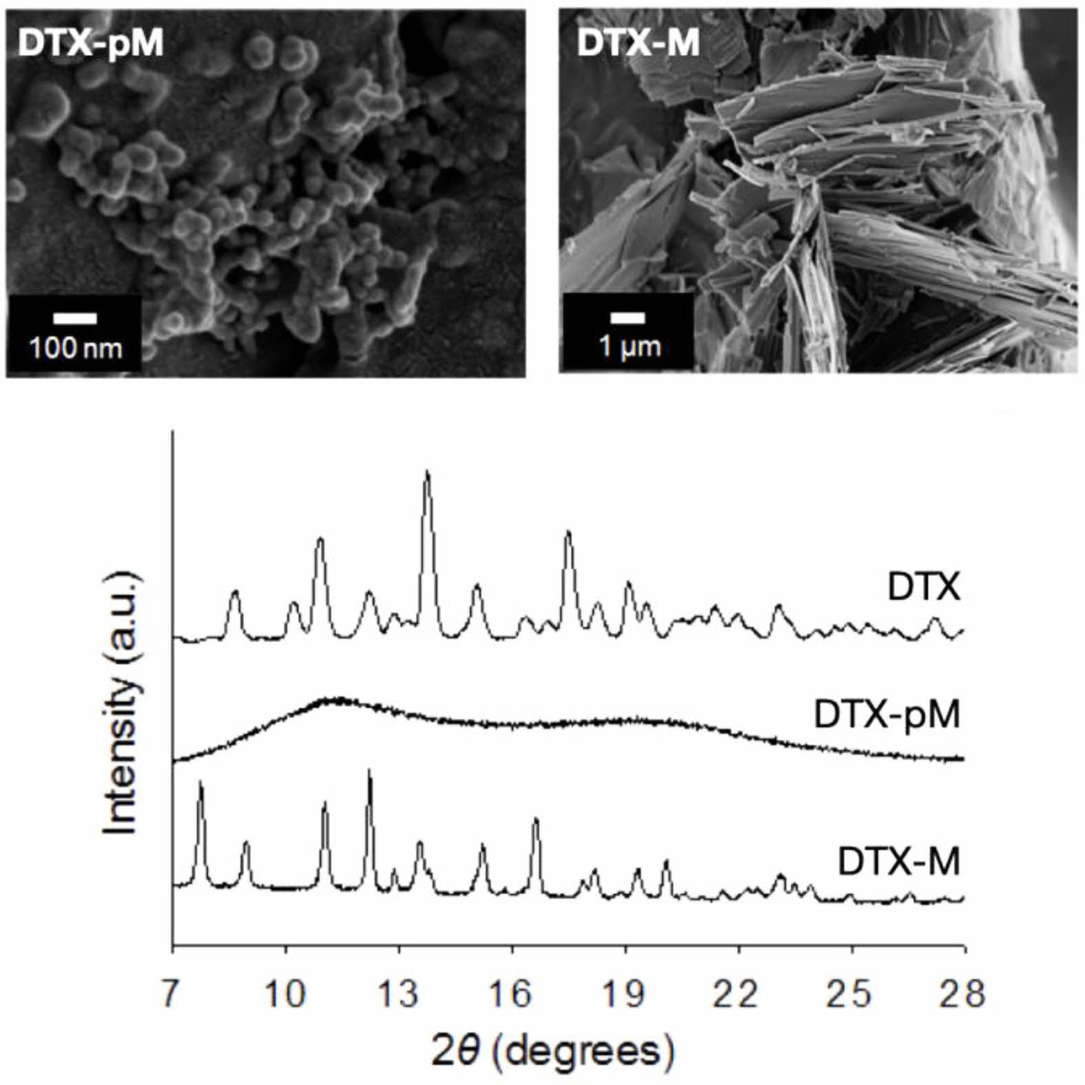 SEM images and XRD patterns of DTX-pM and DTX-M.