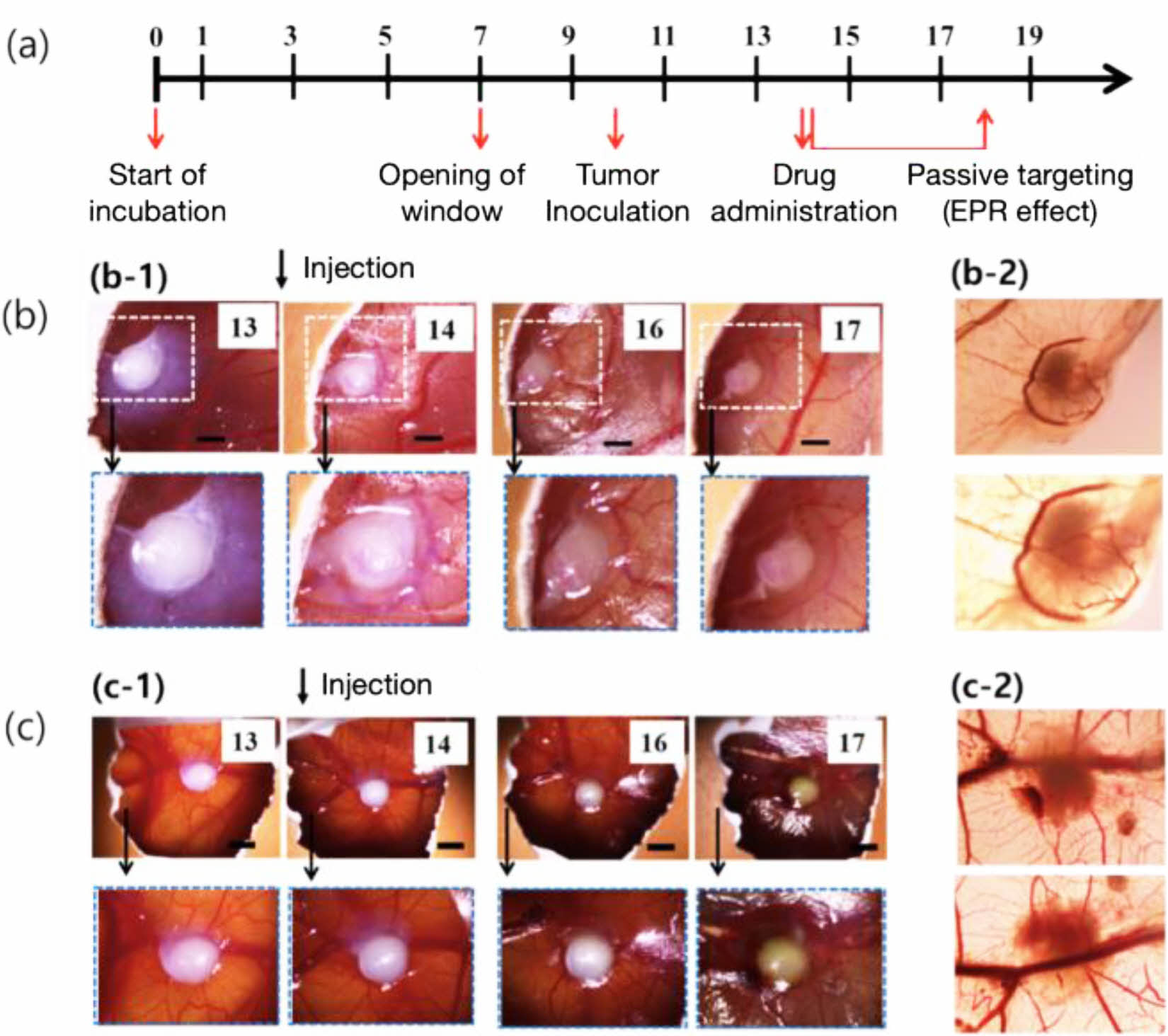 (a) Procedure of the CAM-based ex vivo tumor assay. The images of tumor on CAM after injection of (b) DTX-pM-H; (c) control. The implant sites were further magnified on the backside of the CAM (b-2 and c-2). The scale bars represent 2 mm.