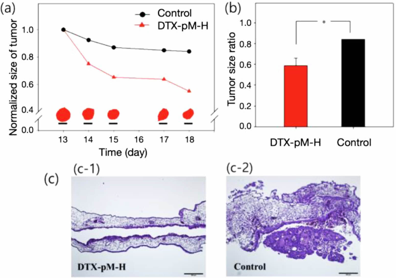 Tumor size with time after injection of (a) DTX-pM-H and control; (b) tumor size ratio. The tumor size was normalized with that before injection. (c) The cross-section stained with the standard Hematoxylin & Eosin (H&E) for histological analysis