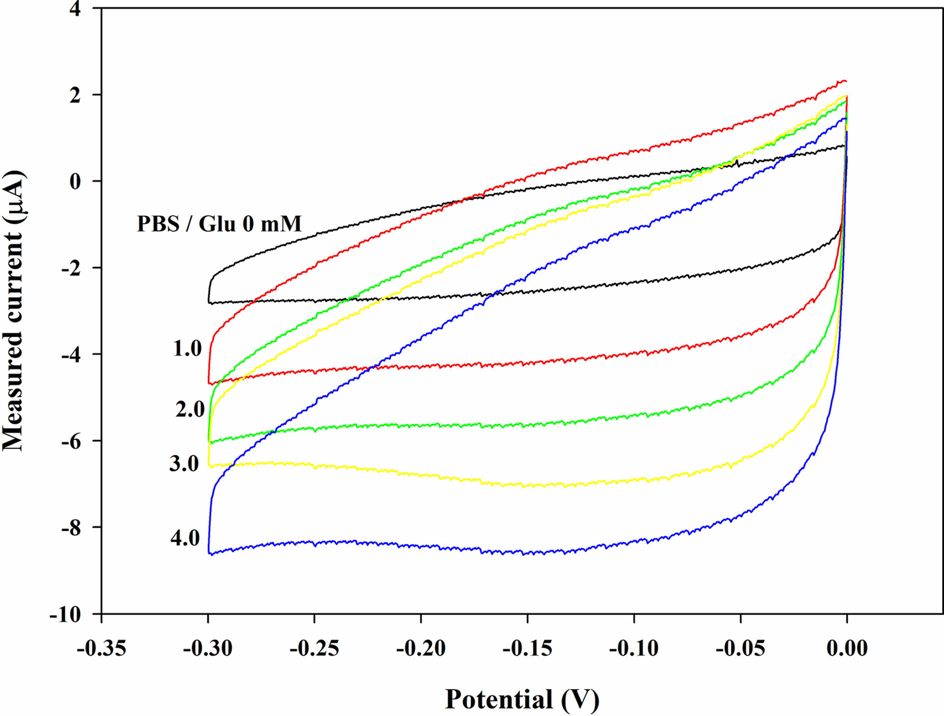 전기화학적 특성 평가. Figure 1은 글루코스 검출 전극에서 글루코스 농도(Cg)에 따른 CV 측정 결과이다. Cg가 증가함에 따라 환원전류는 아래쪽으로 내려가는 것을 관찰할 수 있었지만, 산화 전류는 미세하게 증가하였다. 이는 H2O2에 의한 프러시안 화이트/프러시안 블루의 산화/환원반응의 특징으로 알려져 있다.16,17 순수 PBS(Cg=0)와 글루코스 용액(Cg=4 mM)을 비교하면 환원에 의해 감소전류가 더욱 뚜렷하게 증가하는 것을 확인할 수 있다. 따라서, Cg가 증가함에 따라 GOx에 의해서 H2O2가 더 많이 생성되어 감소 전류가 증가하는 것으로 추정할 수 있다. 이 분석을 통해 글루코스와 GOx의 효소 반응에 의해 생성된 H2O2가 PB와의 효율적인 촉매 반응을 하여 감소전류를 생성하는 것을 보여주며, 전극이 효율적인 전기 촉매 역할을 하고 있음을 보여준다.