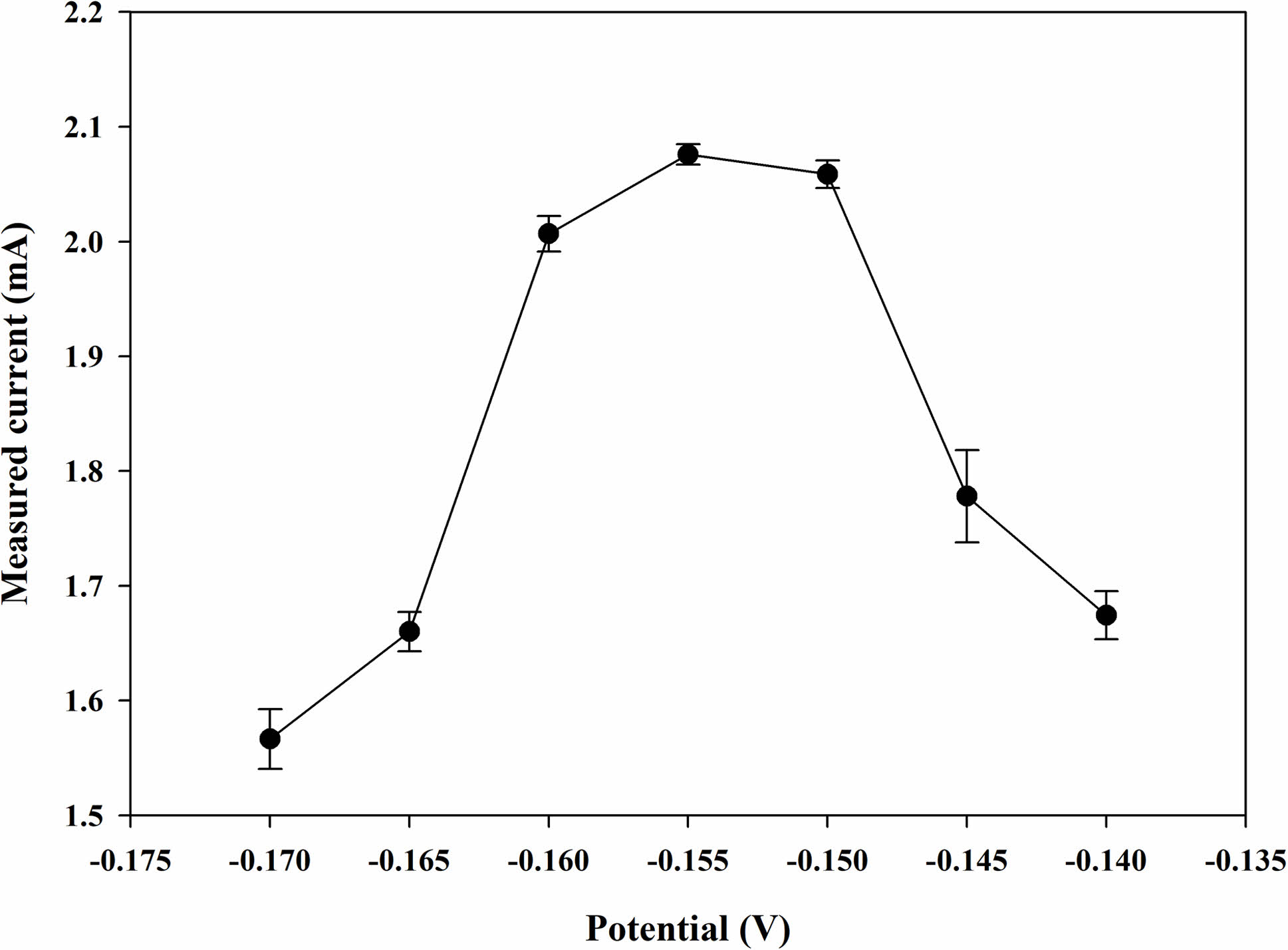 작업 전극에 적용될 전위는 바이오 센서에서 중요한 역할을 한다. CA 분석에서의 최적 전위는 Figure 2와 같이 -0.17 ~ -0.14 V까지의 전위 범위에서 최대 전류를 나타내는 -0.155 V로 결정하였다. 또한, 각 전위에서 5회 반복 테스트를 진행하는 동안 표준편차는 2% 내외로 재현성이 양호한 것을 알 수 있다. 따라서, 이후 진행되는 CA 분석에서 -0.155 V를 이용하여 실험을 진행했다.