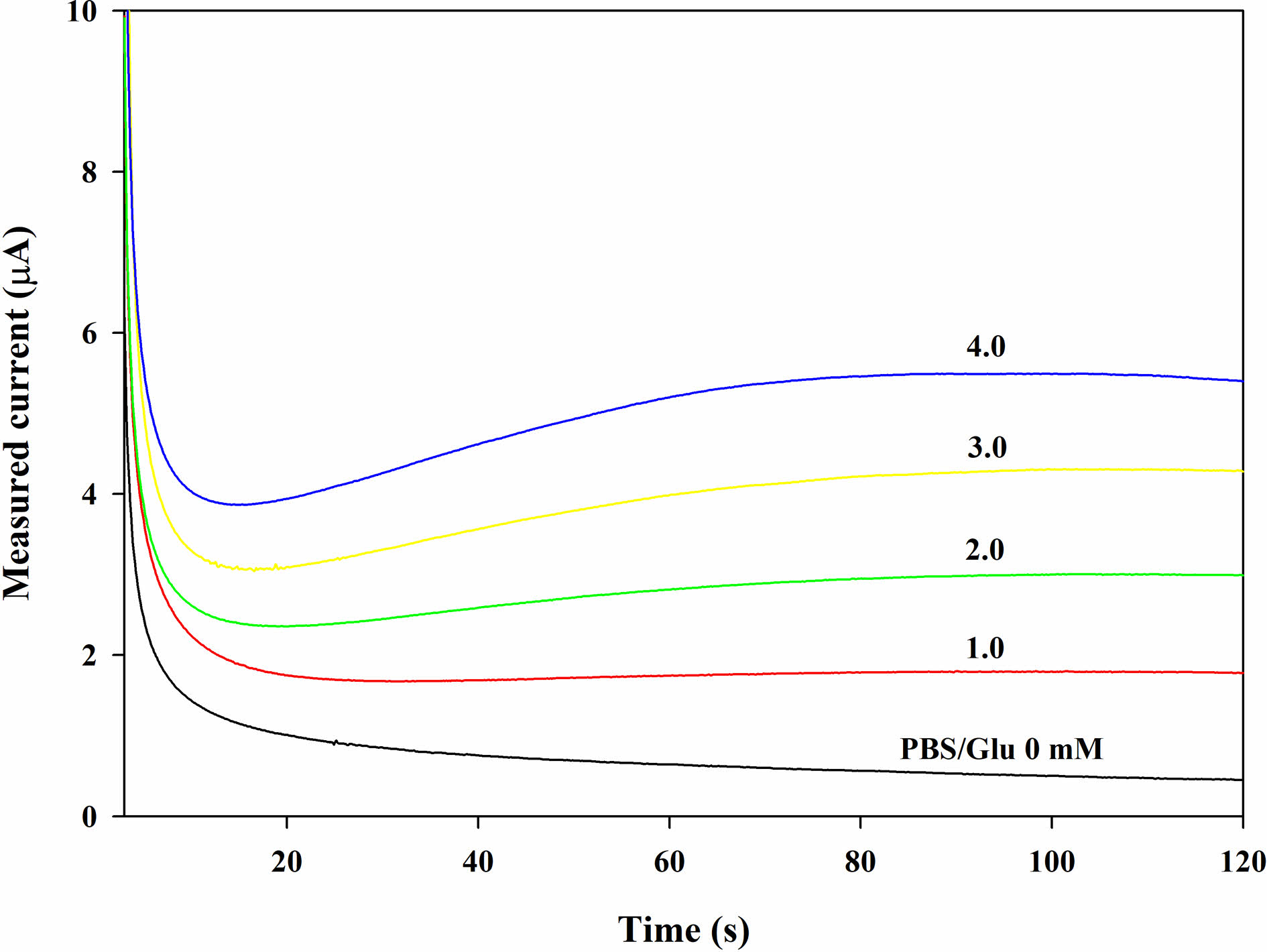 Figure 3은 글루코스 검출 전극에서 글루코스 농도에 따른 CA 결과이다. 120초 동안 각 농도에서의 감소 전류는 일정한 값에 수렴하며, 글루코스의 농도가 증가하는 것에 따라 일정한 간격으로 증가하는 것을 알 수 있다. 따라서, Cg를 달리하여 CA 분석을 하여 -0.155 V에서 120초간 측정한 값을 이용해 Figure 5에서와 같이 검량선으로 만들 수 있다.